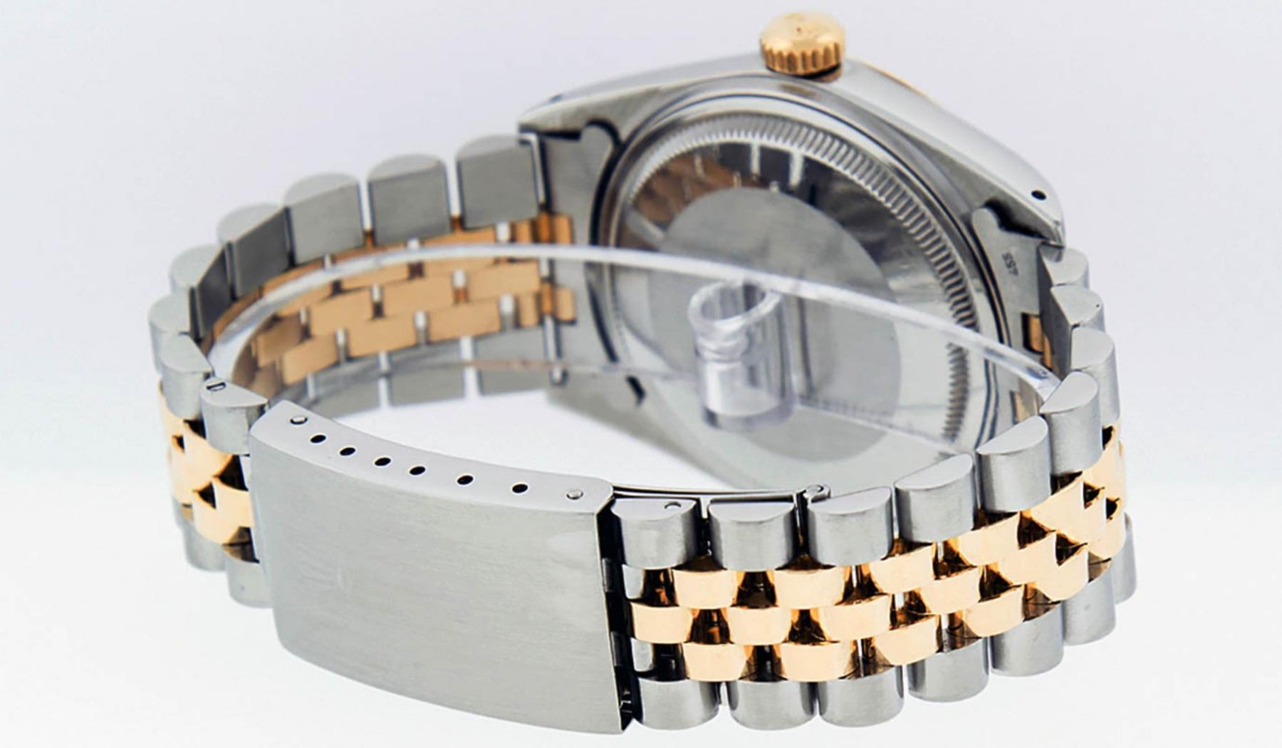 One Mens 14K Yellow Gold Two Tone Rolex Datejust Polished, Serviced & Electronically Tested, 14K Yellow Gold & Stainless Steel Case: 36mm,14K Yellow Gold Crown, Bezel: 14K Yellow Gold Fluted Bezel. Custom Crystal: New Acrylic Cyclops Lens. Custom Hands: New Luminecent Hands. Movement: Automatic Winding Movement Caliber 3035. Dial: Champagne Dial With Index Hour Markers and Small Track. Date Window: 3 O'Clock Position Date Display, Quickset, Model: 16013 Condition: G-6 Extra Fine. Bracelet: Two Tone 14K Yellow Gold & Stainless Steel Jubilee. Bright Polish. 7.0 Inch Length, Adjustable. Standard Clasp, With Rolex Logo. This Watch Has Been Serviced Time Tested And Is In Excellent Condition It Is Free Of All Scratches And Dents.