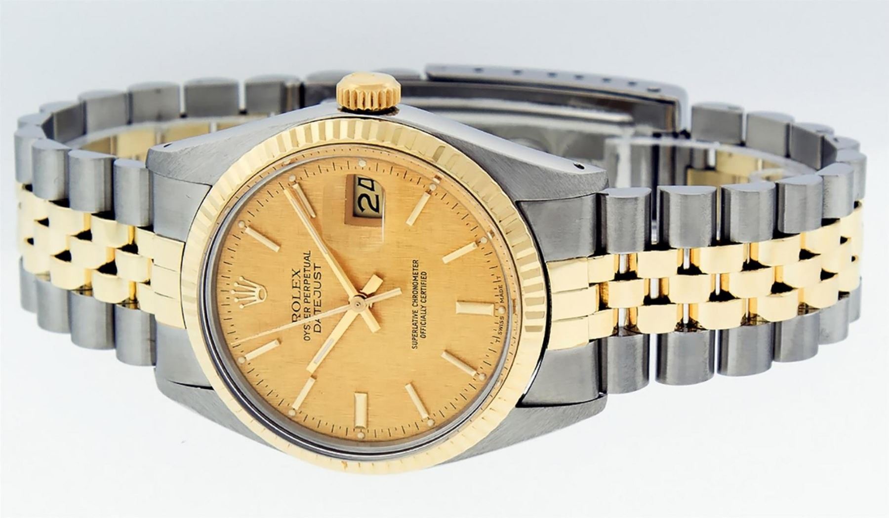One Mens 14K Yellow Gold Two Tone Rolex Datejust Polished, Serviced & Electronically Tested, 14K Yellow Gold & Stainless Steel Case: 36mm, 14K Yellow Gold Crown, Bezel: 14K Yellow Gold Fluted Bezel. Custom Crystal: New Acrylic Cyclops Lens. Custom Hands: New Luminecent Hands. Movement: Automatic Winding Movement Caliber 3035. Dial: Champagne Linen Dial With Index Hour Markers and Small Track With Lumi Dots. Date Window: 3 O'Clock Position Date Display, Quickset, Model: Datejust. Condition: G-6 Extra Fine. Bracelet: Two Tone 14K Yellow Gold & Stainless Steel Jubilee Band. Bright Polish. 7.0 Inch Length, Adjustable. Standard Clasp, With Rolex Logo. This Watch Has Been Serviced Time Tested And Is In Excellent Condition It Is Free Of All Scratches And Dents. This Watch Comes With A Rolex Box.