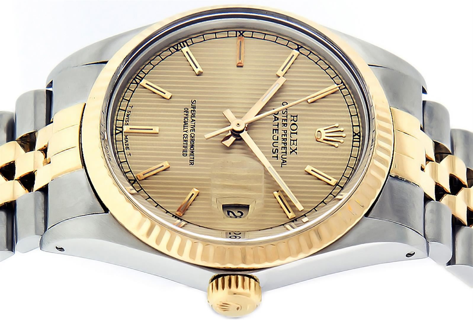 One Mens 14K Yellow Gold Two Tone Rolex Datejust Polished, Serviced & Electronically Tested, 14K Yellow Gold & Stainless Steel Case: 36mm, 14K Yellow Gold Crown, Bezel: 14K Yellow Gold Fluted Bezel. Custom Crystal: New Acrylic Cyclops Lens. Custom Hands: New Luminecent Hands. Movement: Automatic Winding Movement Caliber 3035. Dial: Champagne Tapestry Index Dial With Roman Square Track. Date Window: 3 O'Clock Position Date Display, Quickset, Model: 16013 Datejust. Condition: G-6 Extra Fine. Bracelet: Two Tone 14K Yellow Gold & Stainless Steel Jubilee. Bright Polish. 7.0 Inch Length, Adjustable. Standard Clasp, With Rolex Logo. This Watch Has Been Serviced Time Tested And Is In Excellent Condition It Is Free Of All Scratches And Dents.
