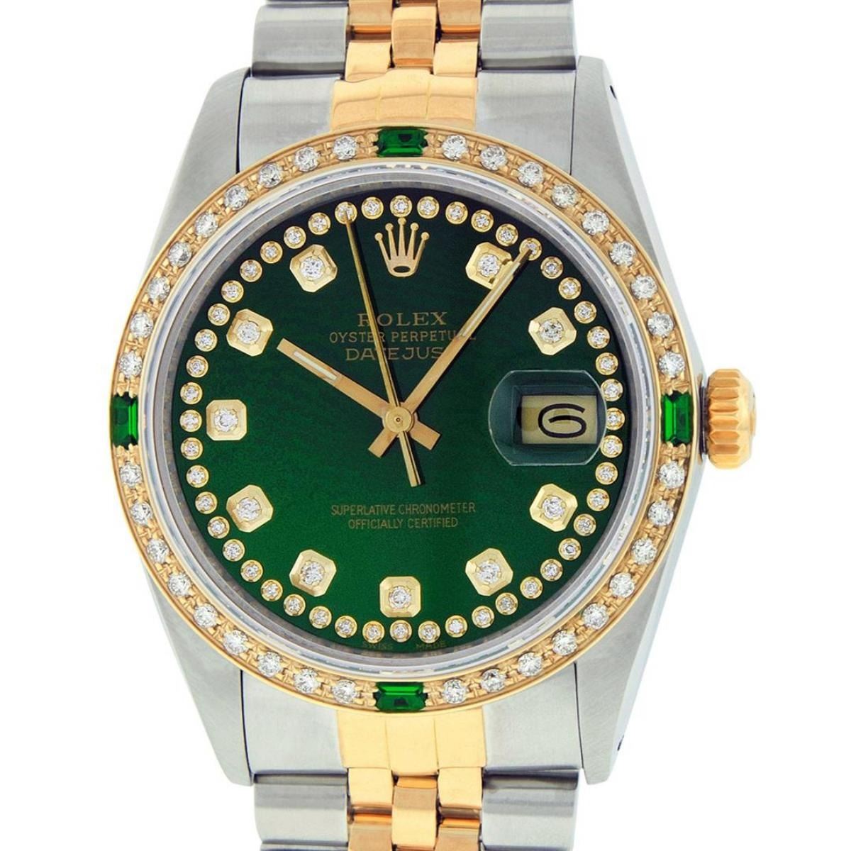 One Mens 14K Yellow Gold Two Tone Rolex Datejust Polished, Serviced & Electronically Tested, 14K Yellow Gold & Stainless Steel Case: 36mm, 14K Yellow Gold Crown, Custom Bezel: New 18K Yellow Gold Emerald Beadset Diamond Bezel, Diamond Count: 36 Diamonds + 4 Emeralds, Total Weight 1.00 Carat, Clarity: SI-VS, Color: G to H. Custom Crystal: New Scratch Resistant Synthetic Sapphire Cyclops Lens. Custom Hands: New Luminecent Hands. Movement: Automatic Winding Movement Caliber 3035. Custom Dial: Green String Diamond Dial, Diamond Count: 58 Diamonds in Dial, G To H In Color, SI-VS Clarity. Date Window: 3 O'Clock Position Date Display, Quickset, Model: 16013 Datejust. Condition: G-6 Extra Fine. Bracelet: Two Tone 14K Yellow Gold & Stainless Steel Jubilee Band. Bright Polish. 7.0 Inch Length, Adjustable. Standard Clasp, With Rolex Logo. This Watch Has Been Serviced Time Tested And Is In Excellent Condition It Is Free Of All Scratches And Dents.
