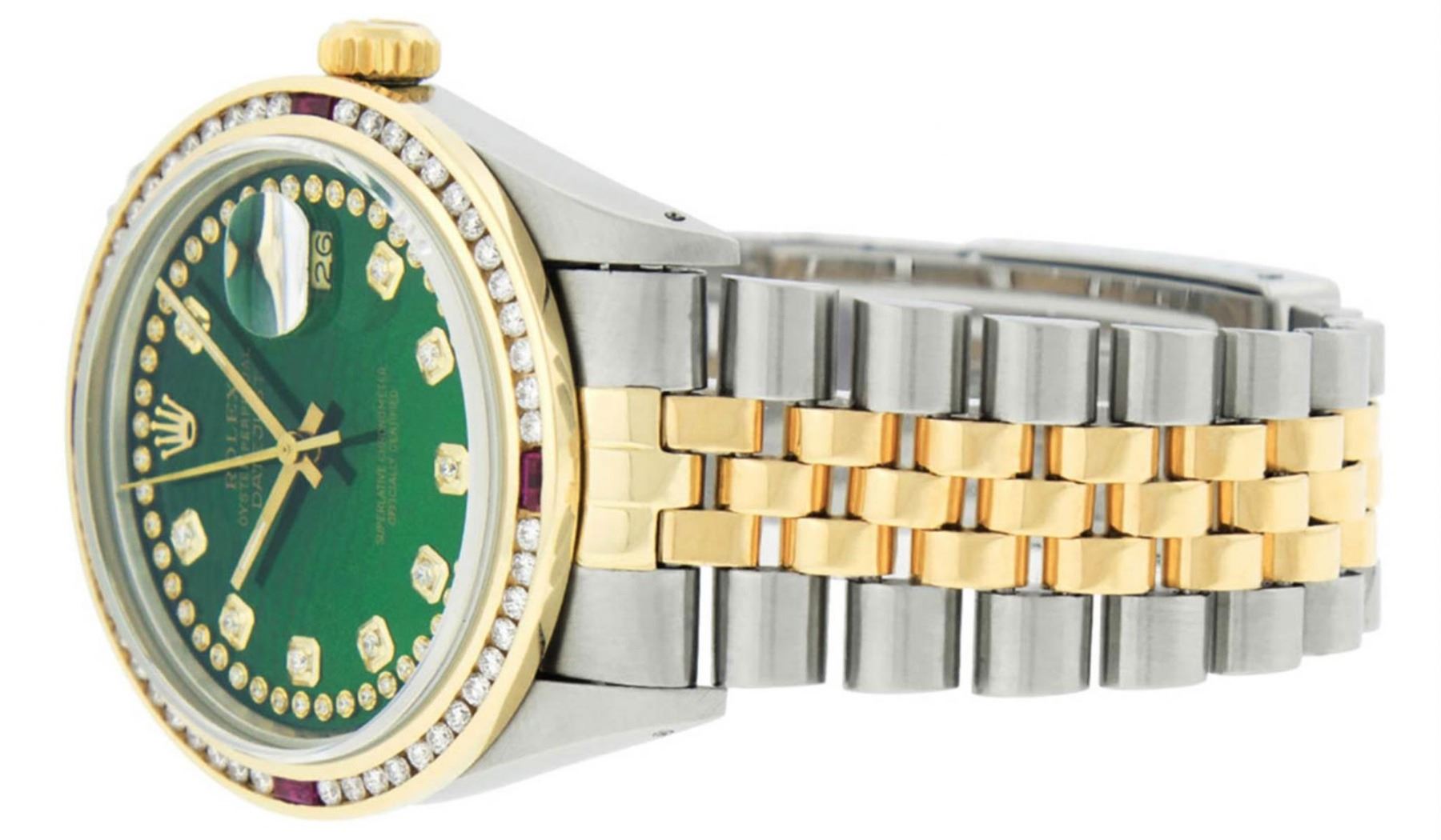 One Mens 14K Yellow Gold Two Tone Rolex Datejust Polished, Serviced & Electronically Tested, 14K Yellow Gold & Stainless Steel Case: 36mm, 14K Yellow Gold Crown, Custom Bezel: 18K Yellow Gold Ruby Channel Set Diamond Bezel, Diamond Count: 52 Diamonds + 4 Rubies, Total Weight 1.30 Carat, Clarity: SI-VS, Color: G to H. Custom Crystal: New Synthetic Sapphire Cyclops Lens. Custom Hands: New Luminecent Hands. Movement: Automatic Winding Movement Caliber 3035. Custom Dial: Green String Diamond Dial, Diamond Count: 58 Diamonds in Dial. Date Window: 3 O'Clock Position Date Display, Quickset, Model: 16013 Datejust. Condition: G-6 Extra Fine. Bracelet:Two Tone 14K Yellow Gold & Stainless Steel Jubilee. Bright Polish. 7.0 Inch Length, Adjustable. Standard Clasp, With Rolex Logo. This Watch Has Been Serviced Time Tested And Is In Excellent Condition It Is Free Of All Scratches And Dents.