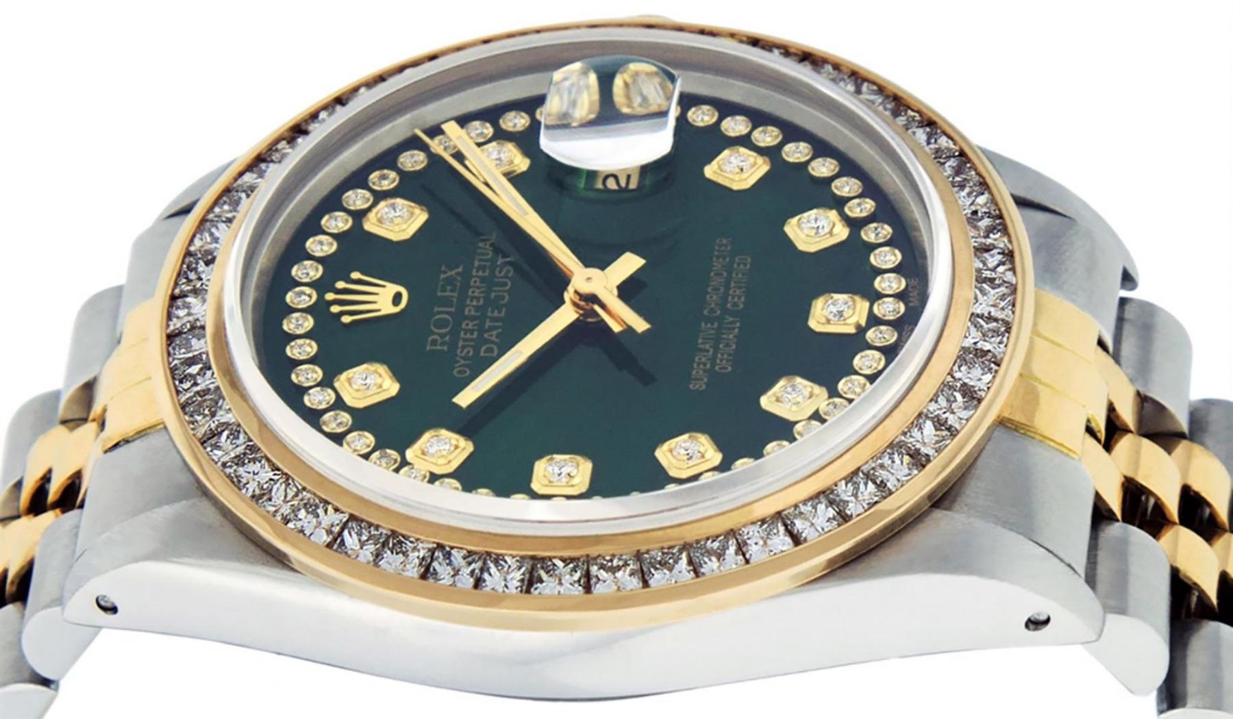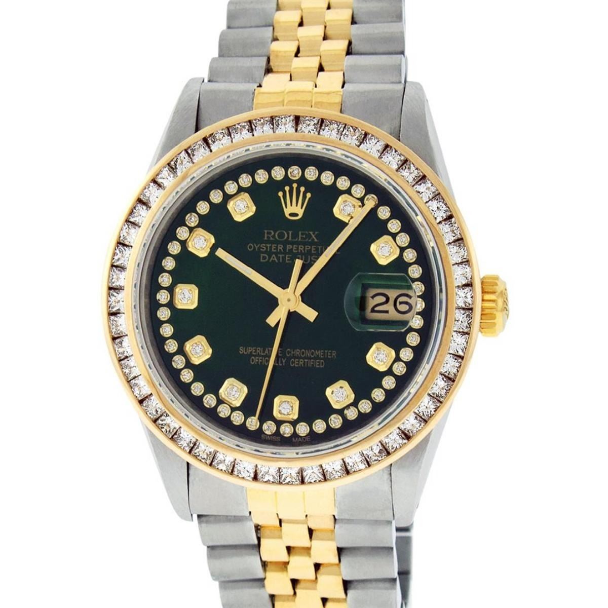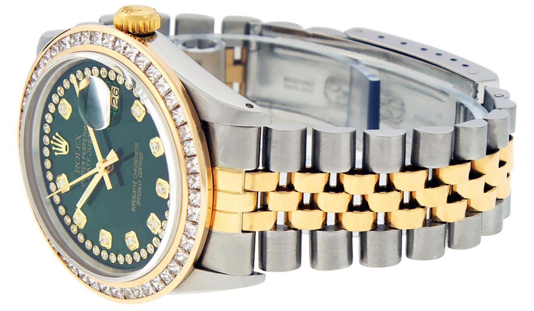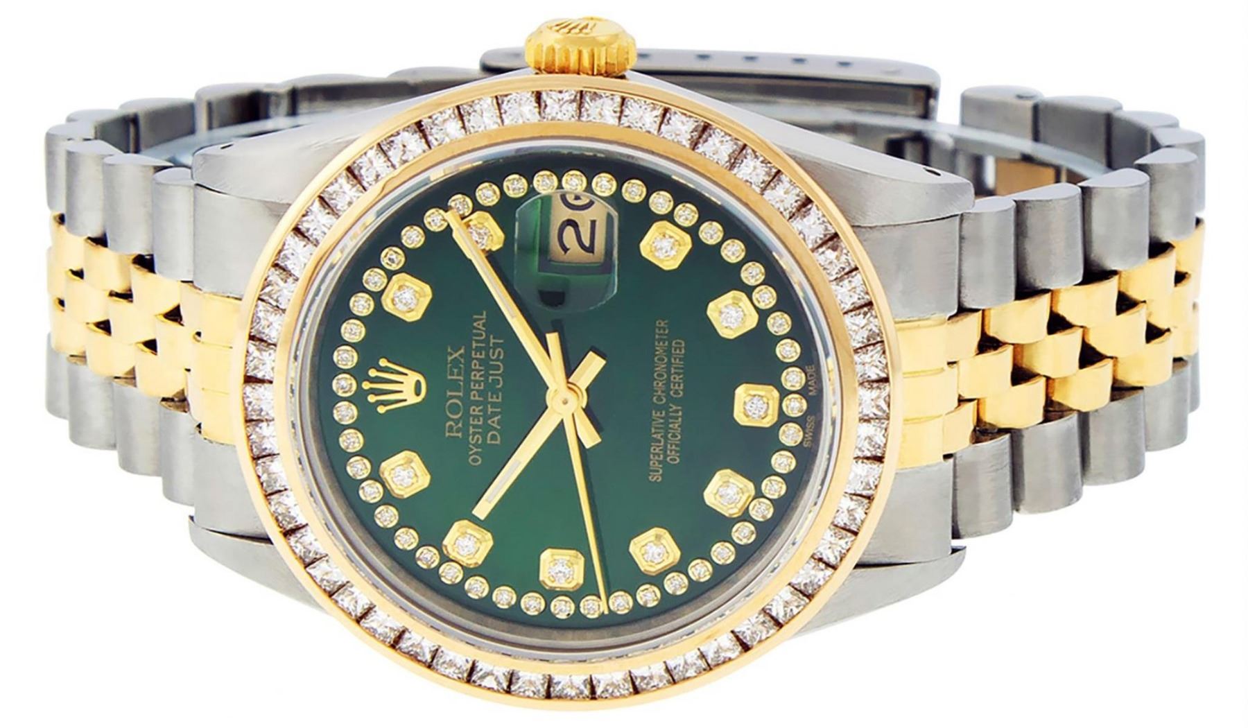One Mens 14K Yellow Gold Two Tone Rolex Datejust Polished Bright with Satin Finish, Serviced & Electronically Tested, 14K Yellow Gold And Stainless Steel Case: 36mm, Yellow Gold Crown, Custom Bezel: New 14K Yellow Gold Princess Cut Diamond Bezel, Diamond Count: 53 Diamonds, Total Weight 2.75 Carat, Clarity: SI-VS, Color: G to H. Custom Crystal: New Synthetic Sapphire Cyclops Lens. Custom Hands: New Luminecent Hands. Movement: Automatic Winding Movement Caliber 3035. Custom Dial: Green String Diamond Dial, Diamond Count: 58 Diamond in Dial, Dial Color: G To H In Color, Clarity: VS2-SI1. Date Window: 3 O'Clock Position Date Display, Quickset, Model: 16013 Datejust. Condition: G-6 Extra Fine. Bracelet: 14K Yellow Gold And Stainless Steel Jubilee. Bright Polish & Satin Finish. 7.0 Inch Length, Adjustable. Standard Clasp, With Rolex Logo. This Watch Has Been Serviced and Polished And It Is Free Of All Dents And Scratches And Has Been Time Tested.