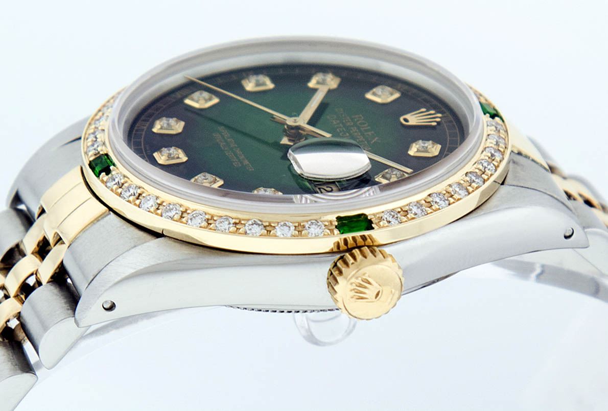 One Mens 14K Yellow Gold Two Tone Rolex Datejust Polished, Serviced & Electronically Tested, 14K Yellow Gold & Stainless Steel Case:36mm, 14K Yellow Gold Crown, Custom Bezel: New 18K Yellow Gold Synthetic Emerald Beadset Diamond Bezel, Diamond Count: 36 Diamonds + 4 Synthetic Emeralds Total Weight 1.00 Carat, Clarity: SI-VS, Color: G to H. Custom Crystal: New Synthetic Sapphire Cyclops Lens. Custom Hands: New Luminecent Hands. Movement: Automatic Winding Movement Caliber 3035. Custom Dial: Green Vignette With Diamond Hour Markers. Diamond Count: 10 Diamonds Clarity: SI-VS, Color: Color G to H Date Window: 3 O'Clock Position Date Display, Quickset, Model: 16013 Condition: G-6 Extra Fine. Bracelet:Two Tone 14K Yellow Gold & Stainless Steel Jubilee. Bright Polish. 7.0 Inch Length, Adjustable. Standard Clasp, With Rolex Logo. This Watch Has Been Serviced Time Tested And Is In Excellent Condition It Is Free Of All Scratches And Dents.
