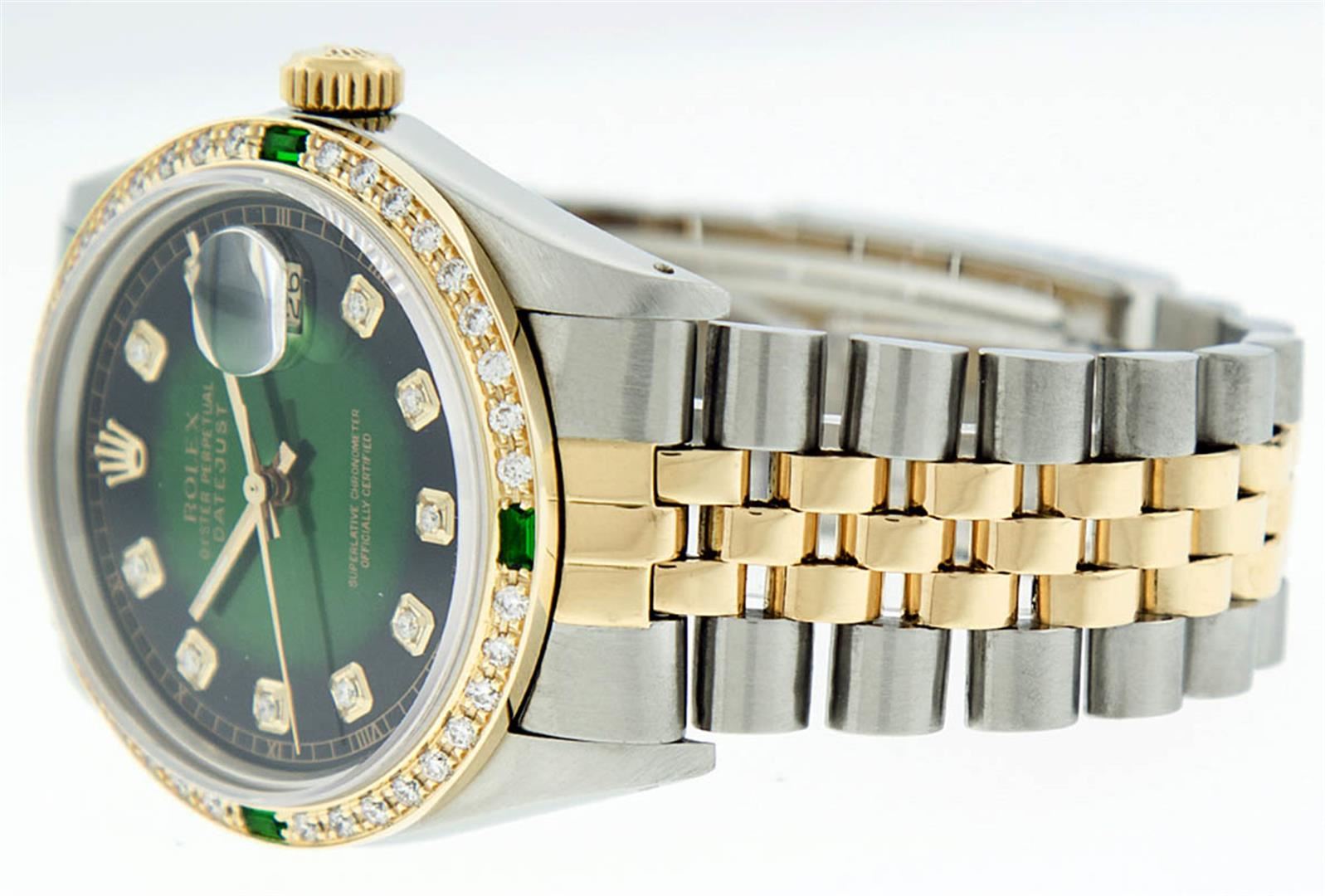 One Mens 14K Yellow Gold Two Tone Rolex Datejust Polished, Serviced & Electronically Tested, 14K Yellow Gold & Stainless Steel Case:36mm, 14K Yellow Gold Crown, Custom Bezel: New 18K Yellow Gold Synthetic Emerald Beadset Diamond Bezel, Diamond Count: 36 Diamonds + 4 Synthetic Emeralds Total Weight 1.00 Carat, Clarity: SI-VS, Color: G to H. Custom Crystal: New Synthetic Sapphire Cyclops Lens. Custom Hands: New Luminecent Hands. Movement: Automatic Winding Movement Caliber 3035. Custom Dial: Green Vignette  With Diamond Hour Markers. Diamond Count: 10 Diamonds Clarity: SI-VS, Color: Color G to H Date Window: 3 O'Clock Position Date Display,  Quickset, Model: 16013 Condition: G-6 Extra Fine. Bracelet:Two Tone 14K Yellow Gold & Stainless Steel Jubilee. Bright Polish.  7.0 Inch Length, Adjustable. Standard Clasp, With Rolex Logo. This Watch Has Been Serviced Time Tested And Is In Excellent Condition It Is Free Of All Scratches And Dents.