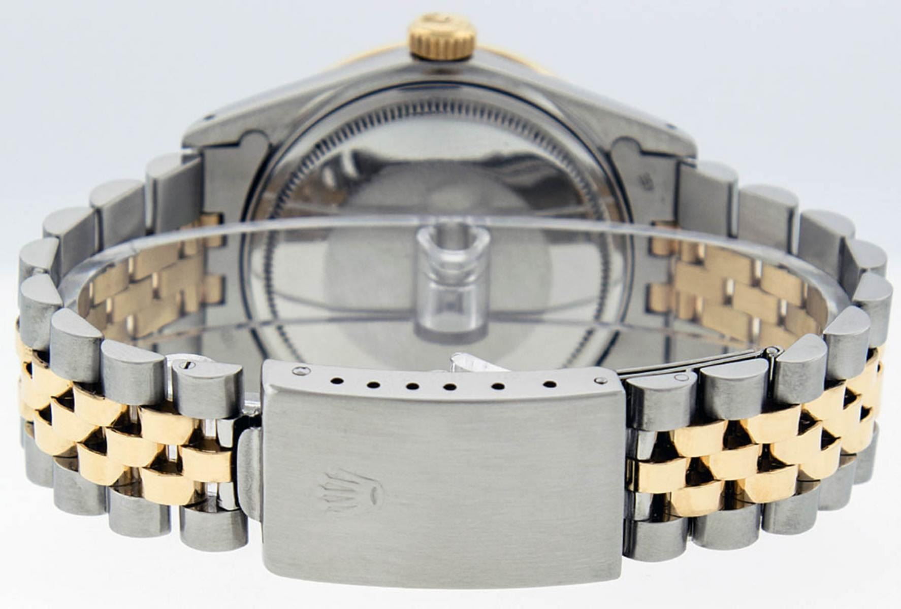 One Mens 14K Yellow Gold Two Tone Rolex Datejust Polished, Serviced & Electronically Tested, 14K Yellow Gold & Stainless Steel Case:36mm, 14K Yellow Gold Crown, Custom Bezel: New 18K Yellow Gold Synthetic Emerald Beadset Diamond Bezel, Diamond Count: 36 Diamonds + 4 Synthetic Emeralds Total Weight 1.00 Carat, Clarity: SI-VS, Color: G to H. Custom Crystal: New Synthetic Sapphire Cyclops Lens. Custom Hands: New Luminecent Hands. Movement: Automatic Winding Movement Caliber 3035. Custom Dial: Green Vignette With Diamond Hour Markers. Diamond Count: 10 Diamonds Clarity: SI-VS, Color: Color G to H Date Window: 3 O'Clock Position Date Display, Quickset, Model: 16013 Condition: G-6 Extra Fine. Bracelet:Two Tone 14K Yellow Gold & Stainless Steel Jubilee. Bright Polish. 7.0 Inch Length, Adjustable. Standard Clasp, With Rolex Logo. This Watch Has Been Serviced Time Tested And Is In Excellent Condition It Is Free Of All Scratches And Dents.