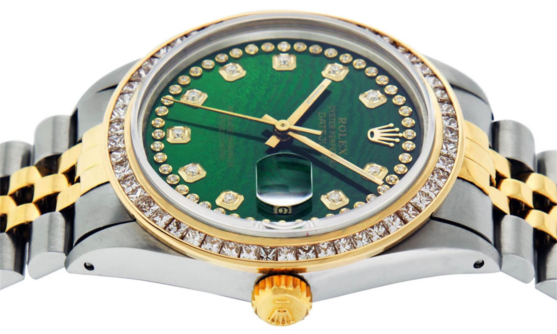 One Mens 14K Yellow Gold Two Tone Rolex Datejust Polished Bright with Satin Finish, Serviced & Electronically Tested, 14K Yellow Gold And Stainless Steel Case: 36mm, Yellow Gold Crown, Custom Bezel: New 14K Yellow Gold Princess Cut Diamond Bezel, Diamond Count: 53 Diamonds, Total Weight 2.75 Carat, Clarity: SI-VS, Color: G to H. Custom Crystal: New Synthetic Sapphire Cyclops Lens. Custom Hands: New Luminecent Hands. Movement: Automatic Winding Movement Caliber 3035. Custom Dial: Green String Diamond Dial, Diamond Count: 58 Diamond in Dial, Dial Color: G To H In Color, Clarity: VS2-SI1. Date Window: 3 O'Clock Position Date Display, Quickset, Model: 16013 Condition: G-6 Extra Fine. Bracelet: 14K Yellow Gold And Stainless Steel Jubilee. Bright Polish & Satin Finish. 7.0 Inch Length, Adjustable. Standard Clasp, With Rolex Logo. This Watch Has Been Serviced and Polished And It Is Free Of All Dents And Scratches And Has Been Time Tested.