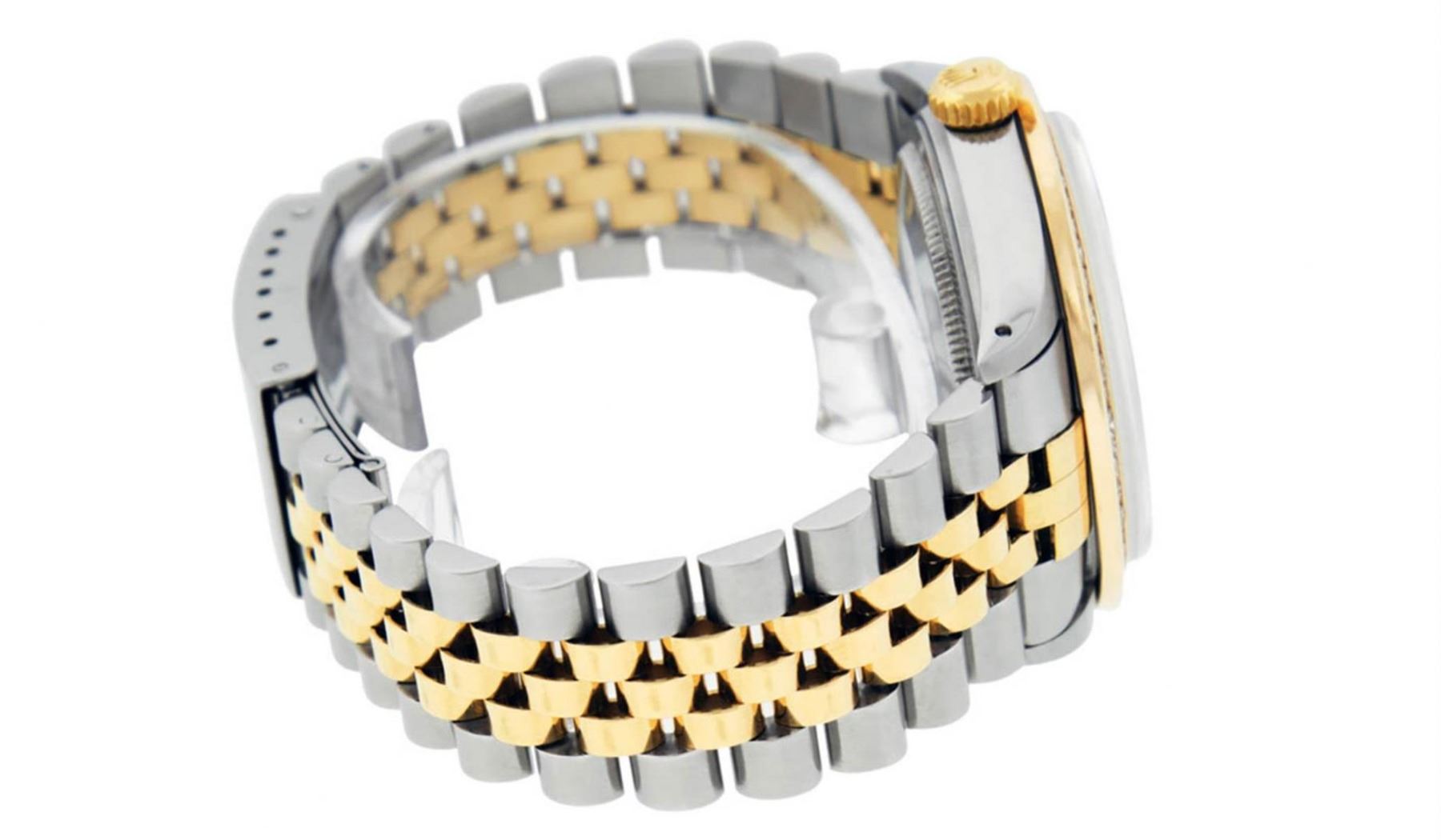 One Mens 14K Yellow Gold Two Tone Rolex Datejust Polished Bright with Satin Finish, Serviced & Electronically Tested, 14K Yellow Gold And Stainless Steel Case: 36mm, Yellow Gold Crown, Custom Bezel: New 14K Yellow Gold Princess Cut Diamond Bezel, Diamond Count: 53 Diamonds, Total Weight 2.75 Carat, Clarity: SI-VS, Color: G to H. Custom Crystal: New Synthetic Sapphire Cyclops Lens. Custom Hands: New Luminecent Hands. Movement: Automatic Winding Movement Caliber 3035. Custom Dial: Green String Diamond Dial, Diamond Count: 58 Diamond in Dial, Dial Color: G To H In Color, Clarity: VS2-SI1. Date Window: 3 O'Clock Position Date Display, Quickset, Model: 16013 Condition: G-6 Extra Fine. Bracelet: 14K Yellow Gold And Stainless Steel Jubilee. Bright Polish & Satin Finish. 7.0 Inch Length, Adjustable. Standard Clasp, With Rolex Logo. This Watch Has Been Serviced and Polished And It Is Free Of All Dents And Scratches And Has Been Time Tested.