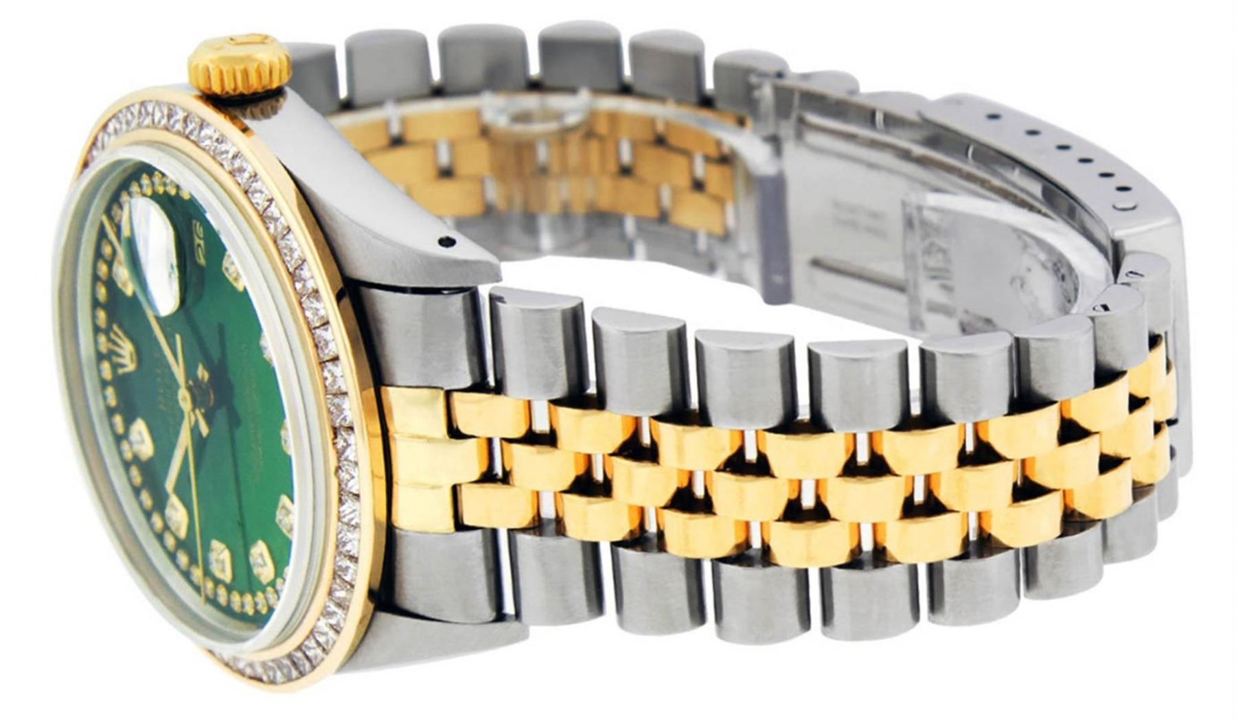 One Mens 14K Yellow Gold Two Tone Rolex Datejust Polished Bright with Satin Finish, Serviced & Electronically Tested, 14K Yellow Gold And Stainless Steel Case: 36mm, Yellow Gold Crown, Custom Bezel: New 14K Yellow Gold Princess Cut Diamond Bezel, Diamond Count: 53 Diamonds, Total Weight 2.75 Carat, Clarity: SI-VS, Color: G to H. Custom Crystal: New Synthetic Sapphire Cyclops Lens. Custom Hands: New Luminecent Hands. Movement: Automatic Winding Movement Caliber 3035. Custom Dial: Green String Diamond Dial, Diamond Count: 58 Diamond in Dial, Dial Color: G To H In Color, Clarity: VS2-SI1. Date Window: 3 O'Clock Position Date Display, Quickset, Model: 16013 Condition: G-6 Extra Fine. Bracelet: 14K Yellow Gold And Stainless Steel Jubilee. Bright Polish & Satin Finish. 7.0 Inch Length, Adjustable. Standard Clasp, With Rolex Logo. This Watch Has Been Serviced and Polished And It Is Free Of All Dents And Scratches And Has Been Time Tested.
