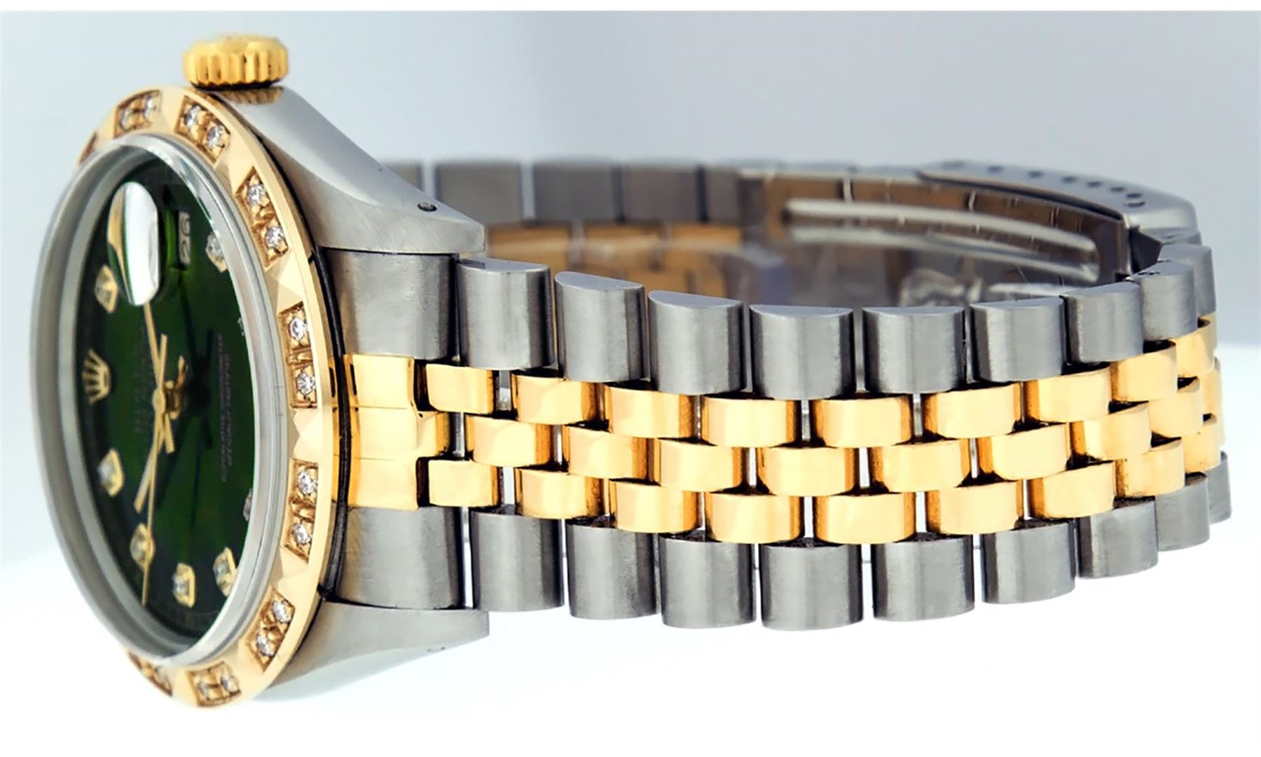 One Mens 14K Yellow Gold Rolex Datejust Polished Bright with Satin Finish, Serviced & Electronically Tested, Stainless Steel Case: 36mm, Yellow Gold Crown, Custom Bezel: New 18K Yellow Gold Pyramid Diamond Bezel, Diamond Count: 24 Diamonds, Total Weight .75 Carat, Clarity: SI-VS, Color: G to H. Custom Crystal: New Scratch Resistant Synthetic Sapphire Cyclops Lens. Custom Hands: New Luminecent Hands. Movement: Automatic Winding Movement Caliber 3035. Custom Dial: Green Vignette Diamond Dial, Diamond Count: 10 Diamonds In Dial, Color: G to H, Clarity: VS. Date Window: 3 O'Clock Position Date Display, Quickset, Model: Datejust. Condition: G-6 Extra Fine. Bracelet: 14K Yellow Gold And Stainless Steel Jubilee Band. Bright Polish & Satin Finish. 7.0 Inch Length, Adjustable. Standard Clasp, With Rolex Logo. This Watch Has Been Serviced And Polished It Is Free Of All Scratches And Dents.