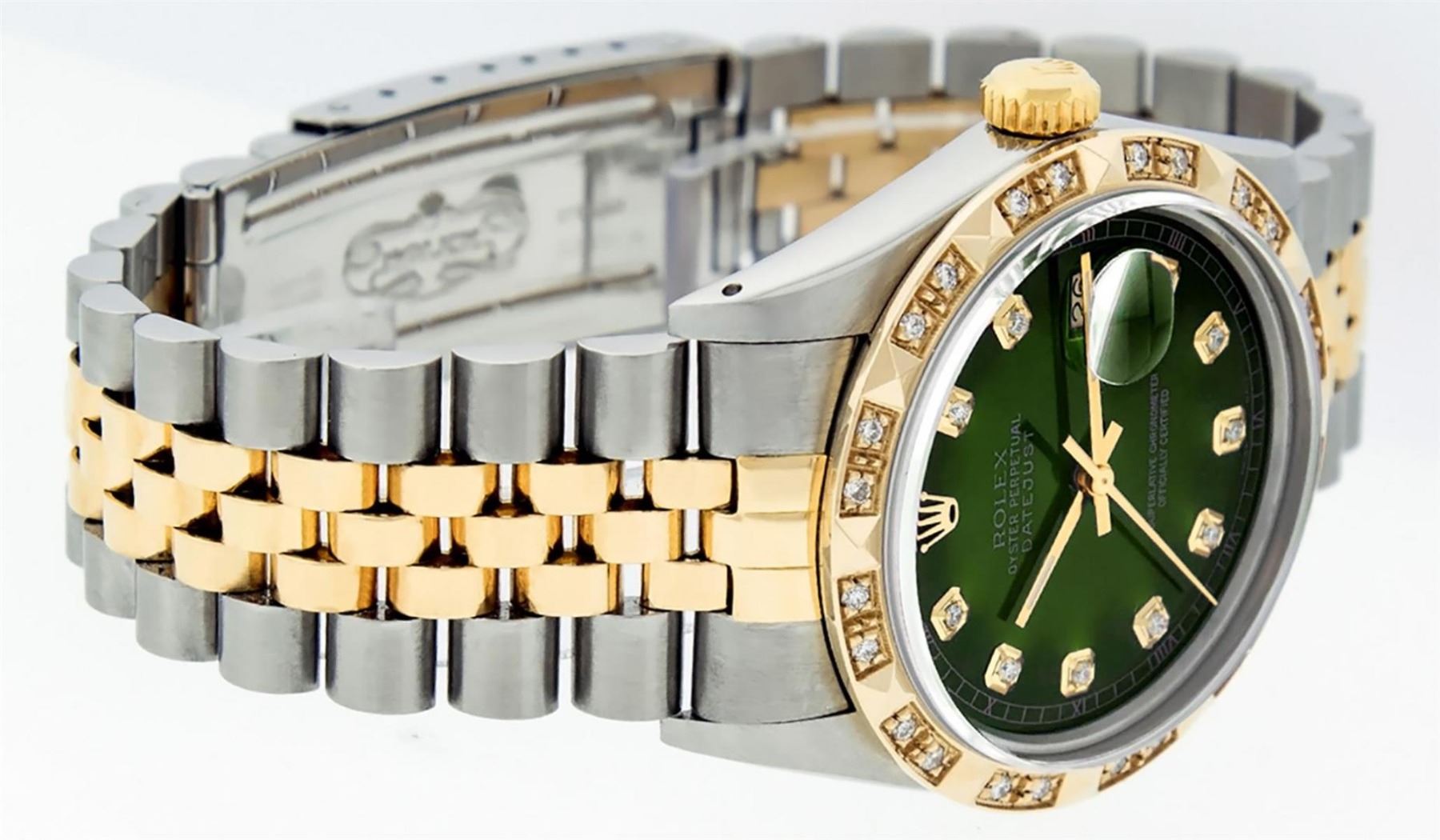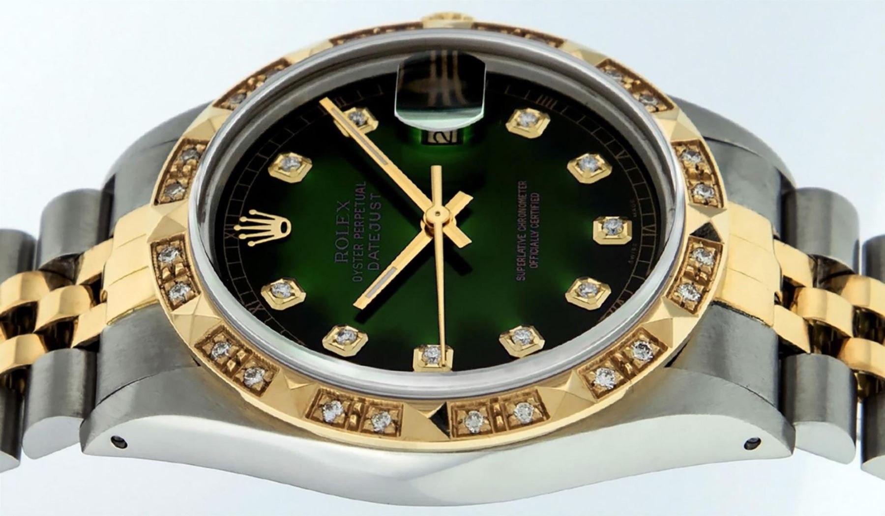 One Mens 14K Yellow Gold Rolex Datejust Polished Bright with Satin Finish, Serviced & Electronically Tested, Stainless Steel Case: 36mm, Yellow Gold Crown, Custom Bezel: New 18K Yellow Gold Pyramid Diamond Bezel, Diamond Count: 24 Diamonds, Total Weight .75 Carat, Clarity: SI-VS, Color: G to H. Custom Crystal: New Scratch Resistant Synthetic Sapphire Cyclops Lens. Custom Hands: New Luminecent Hands. Movement: Automatic Winding Movement Caliber 3035. Custom Dial: Green Vignette Diamond Dial, Diamond Count: 10 Diamonds In Dial, Color: G to H, Clarity: VS. Date Window: 3 O'Clock Position Date Display, Quickset, Model: Datejust. Condition: G-6 Extra Fine. Bracelet: 14K Yellow Gold And Stainless Steel Jubilee Band. Bright Polish & Satin Finish. 7.0 Inch Length, Adjustable. Standard Clasp, With Rolex Logo. This Watch Has Been Serviced And Polished It Is Free Of All Scratches And Dents.