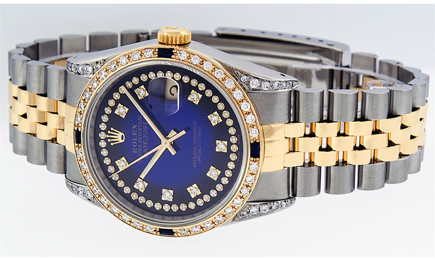 One Mens 14K Yellow Gold Rolex Datejust Polished Bright with Satin Finish, Serviced & Electronically Tested, Stainless Steel Case: 36mm, Custom Diamond Lugs: 28 Diamonds On Lugs, Color: G to H, Clarity: SI-VS. Yellow Gold Crown, Custom Bezel: New 18K Yellow Gold Beadset Diamond + Sapphire Bezel, Diamond + Stone Count: 36Diamonds + 4 Sapphires, Total Weight 1.00 Carat, Clarity: SI-VS, Color: G to H. Custom Crystal: New Scratch Resistant Synthetic Sapphire Cyclops Lens. Custom Hands: New Luminecent Hands. Movement: Automatic Winding Movement Caliber 3035. Custom Dial: Blue Vignette Single Cut String Diamond Dial, Stone Count: 58 Diamonds In Dial, Color: G to H, Clarity: VS2. Date Window: 3 O'Clock Position Date Display, Quickset, Model: 16013 Datejust. Condition: G-6 Extra Fine. Bracelet: 14K Yellow Gold And Stainless Steel Jubilee Band. Bright Polish & Satin Finish. 7.0 Inch Length, Adjustable. Standard Clasp, With Rolex Logo. This Watch Has Been Serviced And Polished It Is Free Of All Scratches And Dents.