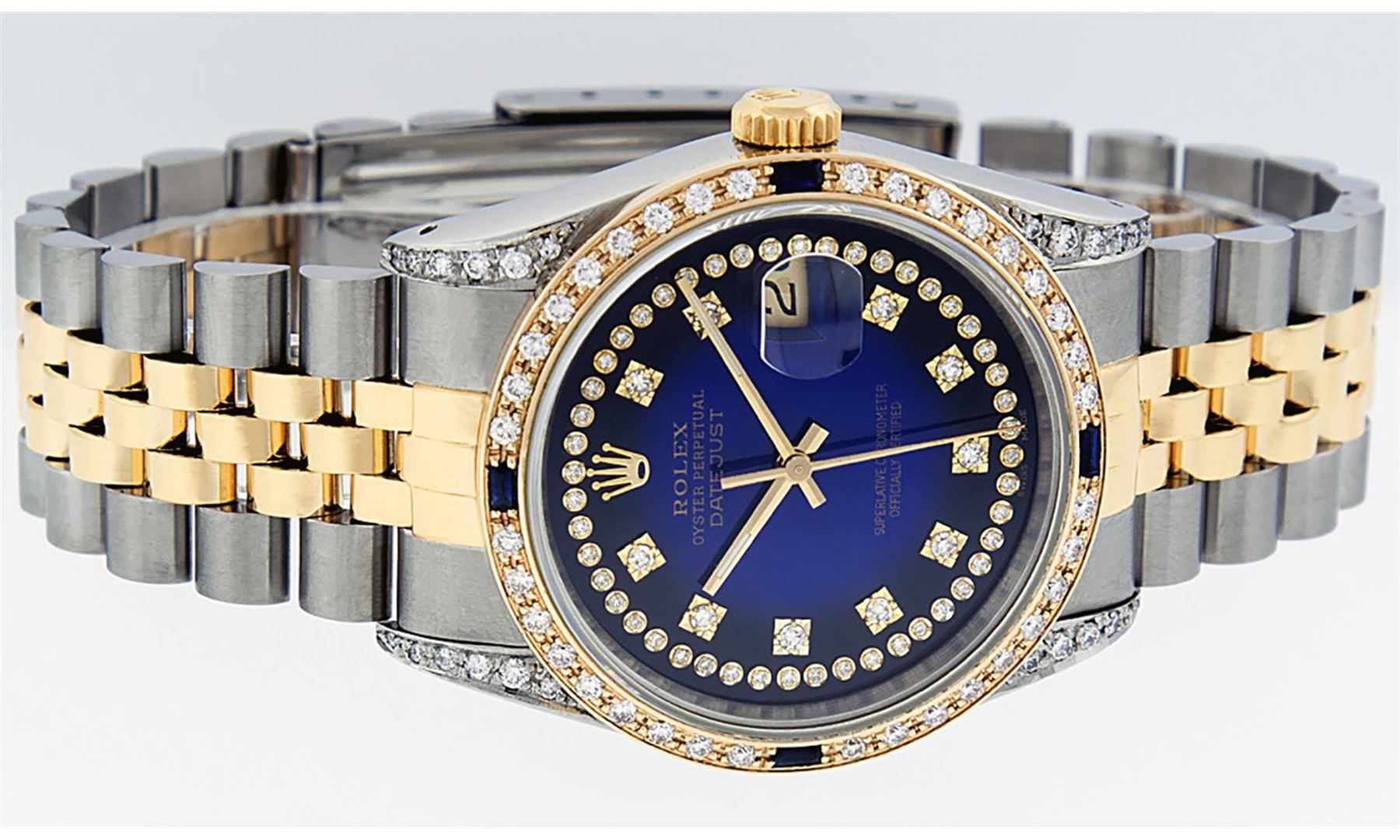 One Mens 14K Yellow Gold Rolex Datejust Polished Bright with Satin Finish, Serviced & Electronically Tested, Stainless Steel Case: 36mm, Custom Diamond Lugs: 28 Diamonds On Lugs, Color: G to H, Clarity: SI-VS. Yellow Gold Crown, Custom Bezel: New 18K Yellow Gold Beadset Diamond + Sapphire Bezel, Diamond + Stone Count: 36Diamonds + 4 Sapphires, Total Weight 1.00 Carat, Clarity: SI-VS, Color: G to H. Custom Crystal: New Scratch Resistant Synthetic Sapphire Cyclops Lens. Custom Hands: New Luminecent Hands. Movement: Automatic Winding Movement Caliber 3035. Custom Dial: Blue Vignette Single Cut String Diamond Dial, Stone Count: 58 Diamonds In Dial, Color: G to H, Clarity: VS2. Date Window: 3 O'Clock Position Date Display, Quickset, Model: 16013 Datejust. Condition: G-6 Extra Fine. Bracelet: 14K Yellow Gold And Stainless Steel Jubilee Band. Bright Polish & Satin Finish. 7.0 Inch Length, Adjustable. Standard Clasp, With Rolex Logo. This Watch Has Been Serviced And Polished It Is Free Of All Scratches And Dents.