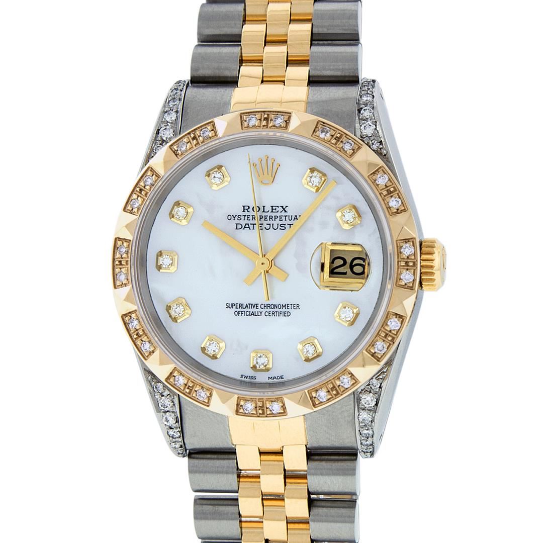 One Mens 14K Yellow Gold Rolex Datejust Polished Bright with Satin Finish, Serviced & Electronically Tested, Stainless Steel Case: 36mm, Custom Diamond Lugs: 28 Diamonds In Lugs, Color: G to H, Clarity: SI-VS. Yellow Gold Crown, Custom Bezel: New 18K Yellow Gold Pyramid Diamond Bezel, Diamond Count: 24 Diamonds, Total Weight .75 Carat, Clarity: SI-VS, Color: G to H. Custom Crystal: New Scratch Resistant Synthetic Sapphire Cyclops Lens. Custom Hands: New Luminecent Hands. Movement: Automatic Winding Movement Caliber 3035. Custom Dial: Mother Of Pearl Diamond, Stone Count: 10 Diamonds On Dial, Color: G to H, Clarity: VS. Date Window: 3 O'Clock Position Date Display, Quickset, Model: Datejust. Condition: G-6 Extra Fine. Bracelet: 14K Yellow Gold And Stainless Steel Jubilee Band. Bright Polish & Satin Finish. 7.0 Inch Length, Adjustable. Standard Clasp, With Rolex Logo. This Watch Has Been Serviced And Polished It Is Free Of All Scratches And Dents.