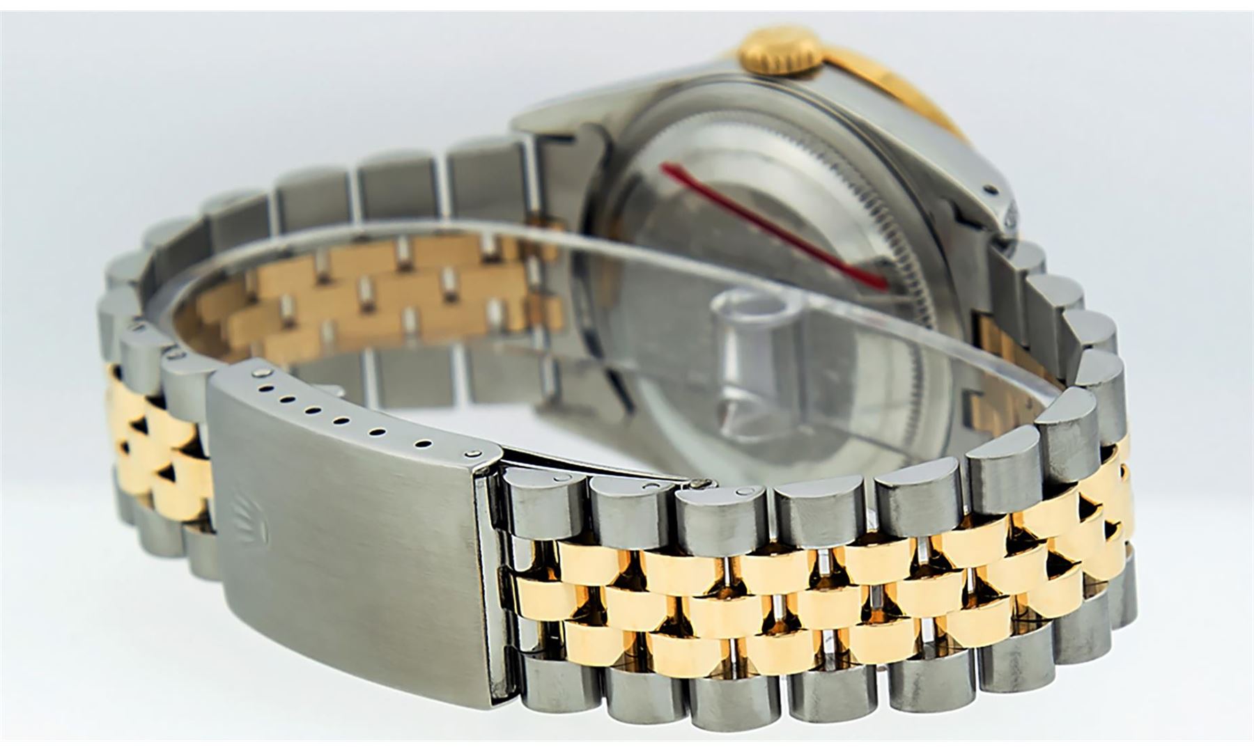 One Mens 14K Yellow Gold Rolex Datejust Polished Bright with Satin Finish, Serviced & Electronically Tested, Stainless Steel Case: 36mm, Custom Diamond Lugs: 28 Diamonds In Lugs, Color: G to H, Clarity: SI-VS. Yellow Gold Crown, Custom Bezel: New 18K Yellow Gold Pyramid Diamond Bezel, Diamond Count: 24 Diamonds, Total Weight .75 Carat, Clarity: SI-VS, Color: G to H. Custom Crystal: New Scratch Resistant Synthetic Sapphire Cyclops Lens. Custom Hands: New Luminecent Hands. Movement: Automatic Winding Movement Caliber 3035. Custom Dial: Mother Of Pearl Diamond, Stone Count: 10 Diamonds On Dial, Color: G to H, Clarity: VS. Date Window: 3 O'Clock Position Date Display, Quickset, Model: Datejust. Condition: G-6 Extra Fine. Bracelet: 14K Yellow Gold And Stainless Steel Jubilee Band. Bright Polish & Satin Finish. 7.0 Inch Length, Adjustable. Standard Clasp, With Rolex Logo. This Watch Has Been Serviced And Polished It Is Free Of All Scratches And Dents.