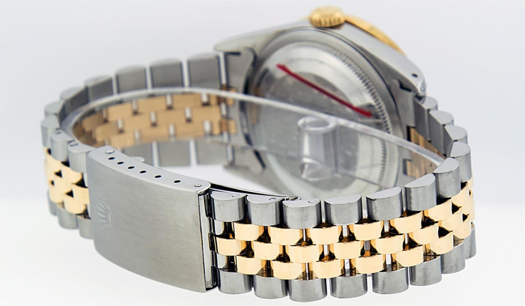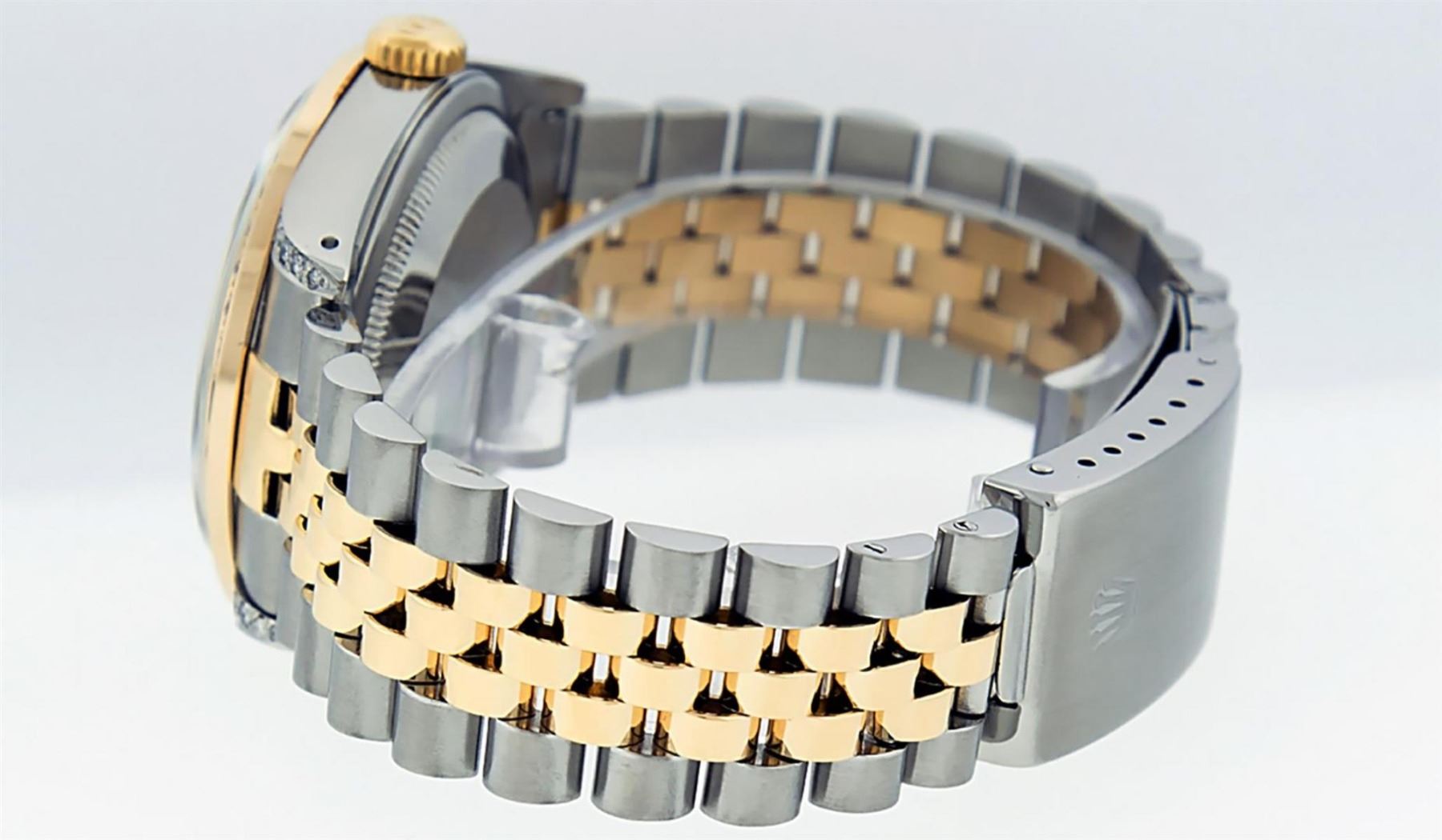 One Mens 14K Yellow Gold Rolex Datejust Polished Bright with Satin Finish, Serviced & Electronically Tested, Stainless Steel Case: 36mm, Custom Diamond Lugs: 28 Diamonds In Lugs, Color: G to H, Clarity: SI-VS. Yellow Gold Crown, Custom Bezel: New 18K Yellow Gold Sapphire + Diamond Bezel, Stone Count: 36 Diamonds + 4 Sapphires, Total Weight 1.00 Carat, Clarity: SI-VS, Color: G to H. Custom Crystal: New Scratch Resistant Synthetic Sapphire Cyclops Lens. Custom Hands: New Luminecent Hands. Movement: Automatic Winding Movement Caliber 3035. Custom Dial: Mother Of Pearl Diamond, Stone Count: 10 Diamonds In Dial, Color: G to H, Clarity: VS. Date Window: 3 O'Clock Position Date Display, Quickset, Model: Datejust. Condition: G-6 Extra Fine. Bracelet: 14K Yellow Gold And Stainless Steel Jubilee Band. Bright Polish & Satin Finish. 7.0 Inch Length, Adjustable. Standard Clasp, With Rolex Logo. This Watch Has Been Serviced And Polished It Is Free Of All Scratches And Dents.
