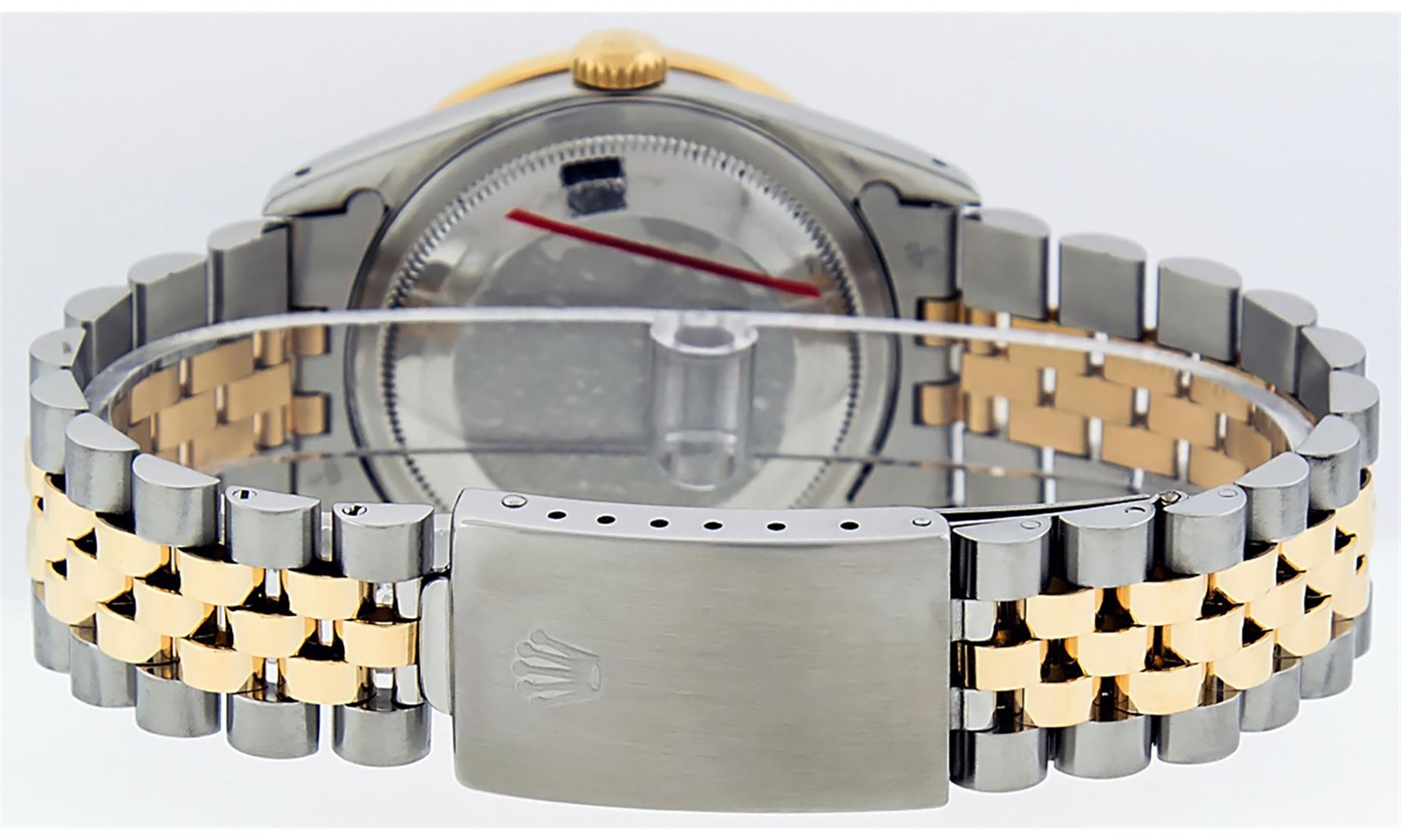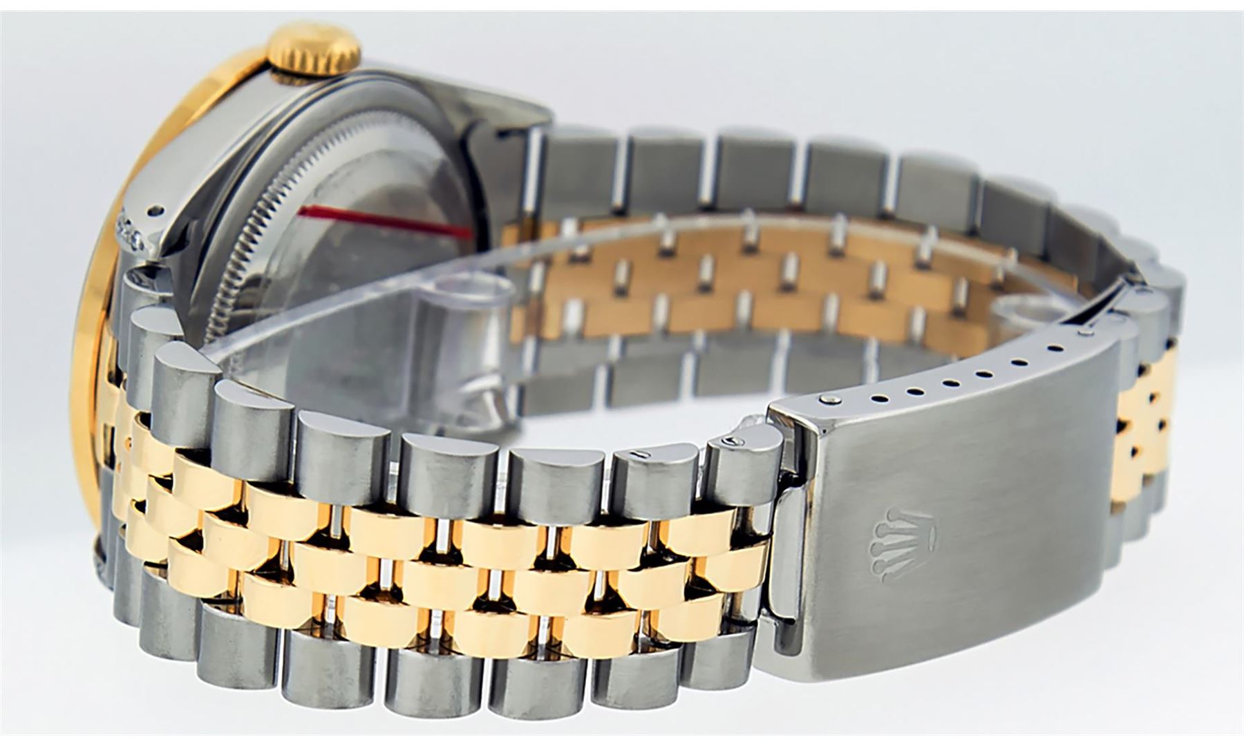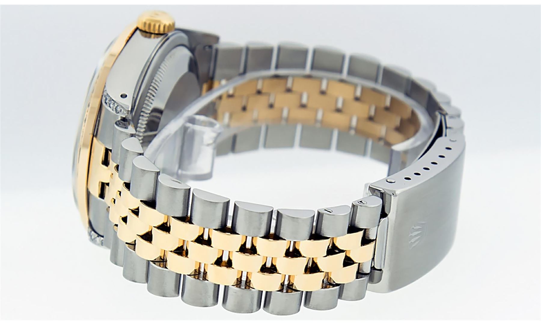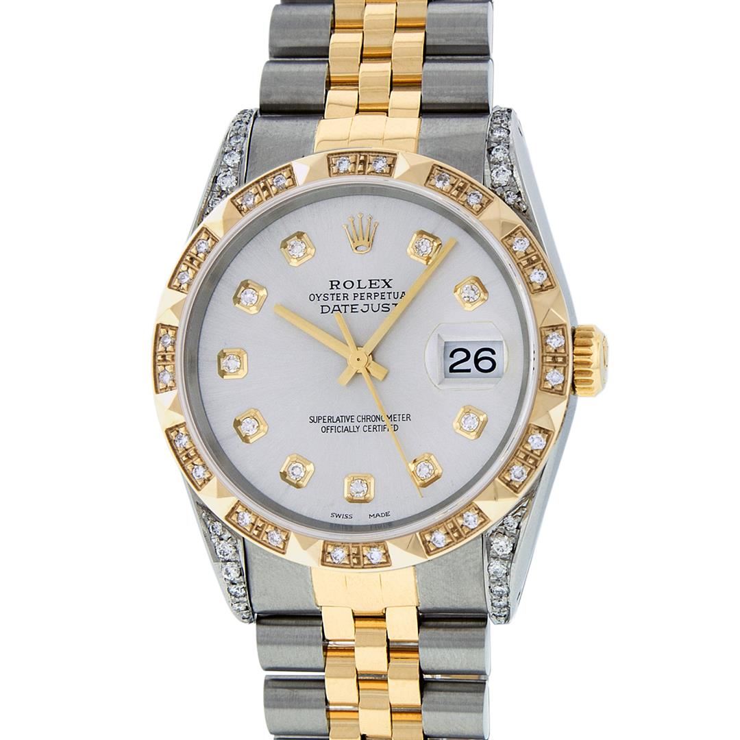 One Mens 14K Yellow Gold Rolex Datejust Polished Bright with Satin Finish, Serviced & Electronically Tested, Stainless Steel Case: 36mm, Custom Diamond Lugs: 28 Diamonds In Lugs, Color: G to H, Clarity: SI-VS. Yellow Gold Crown, Custom Bezel: New 18K Yellow Gold Pyramid Diamond Bezel, Diamond Count: 24 Diamonds, Total Weight .75 Carat, Clarity: SI-VS, Color: G to H. Custom Crystal: New Scratch Resistant Synthetic Sapphire Cyclops Lens. Custom Hands: New Luminecent Hands. Movement: Automatic Winding Movement Caliber 3035. Custom Dial: Silver Diamond Dial, Stone Count: 10 Diamonds In Dial, Color: G to H, Clarity: VS. Date Window: 3 O'Clock Position Date Display, Quickset, Model: Datejust. Condition: G-6 Extra Fine. Bracelet: 14K Yellow Gold And Stainless Steel Jubilee Band. Bright Polish & Satin Finish. 7.0 Inch Length, Adjustable. Standard Clasp, With Rolex Logo. This Watch Has Been Serviced And Polished It Is Free Of All Scratches And Dents.