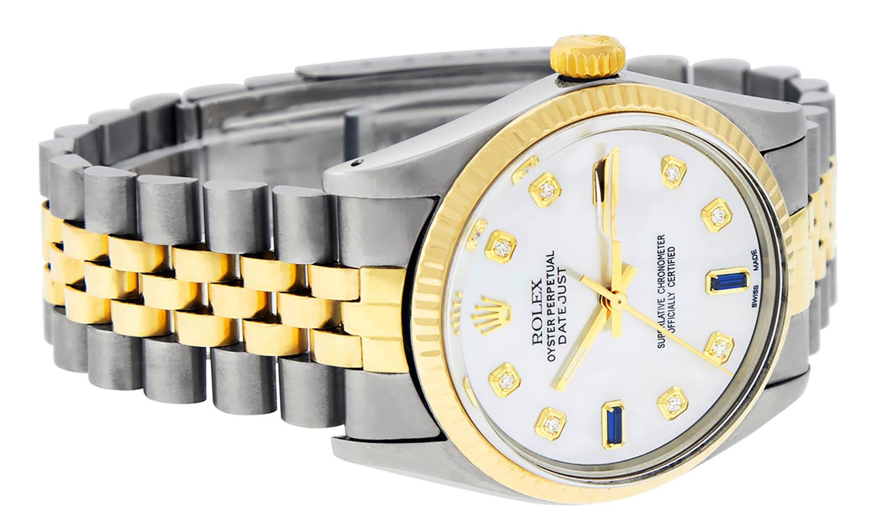 One Mens 14K Yellow Gold Two Tone Rolex Datejust Polished, Serviced & Electronically Tested, 14K Yellow Gold & Stainless Steel Case: 36mm, 14K Yellow Gold Crown, Bezel: 14K Yellow Gold Fluted Bezel. Custom Crystal: New Acrylic Cyclops Lens. Custom Hands: New Luminecent Hands. Movement: Automatic Winding Movement Caliber 3035. Custom Dial: Mother Of Pearl Diamond Dial, Stone Count: 8 Diamonds + 2 Synthetic Sapphire Baguettes in Dial, G To H In Color, SI-VS Clarity. Date Window: 3 O'Clock Position Date Display, Quickset, Model: 16013 Datejust. Condition: G-6 Extra Fine. Bracelet: Two Tone 14K Yellow Gold & Stainless Steel Jubilee. Bright Polish. 7.0 Inch Length, Adjustable. Standard Clasp, With Rolex Logo. This Watch Has Been Serviced And Polished It Is Free Of All Scratches And Dents.