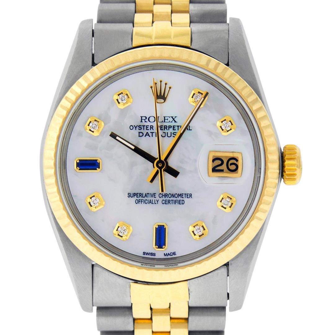One Mens 14K Yellow Gold Two Tone Rolex Datejust Polished, Serviced & Electronically Tested, 14K Yellow Gold & Stainless Steel Case: 36mm, 14K Yellow Gold Crown, Bezel: 14K Yellow Gold Fluted Bezel. Custom Crystal: New Acrylic Cyclops Lens. Custom Hands: New Luminecent Hands. Movement: Automatic Winding Movement Caliber 3035. Custom Dial: Mother Of Pearl Diamond Dial, Stone Count: 8 Diamonds + 2 Synthetic Sapphire Baguettes in Dial, G To H In Color, SI-VS Clarity. Date Window: 3 O'Clock Position Date Display, Quickset, Model: 16013 Datejust. Condition: G-6 Extra Fine. Bracelet: Two Tone 14K Yellow Gold & Stainless Steel Jubilee. Bright Polish. 7.0 Inch Length, Adjustable. Standard Clasp, With Rolex Logo. This Watch Has Been Serviced And Polished It Is Free Of All Scratches And Dents.