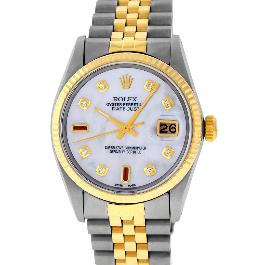 One Mens 14K Yellow Gold Two Tone Rolex Datejust Polished, Serviced & Electronically Tested, 14K Yellow Gold & Stainless Steel Case: 36mm, 14K Yellow Gold Crown, Bezel: 14K Yellow Gold Fluted Bezel. Custom Crystal: New Acrylic Cyclops Lens. Custom Hands: New Luminecent Hands. Movement: Automatic Winding Movement Caliber 3035. Custom Dial: Mother Of Pearl Diamond Dial, Stone Count: 8 Diamonds + 2 Synthetic Ruby Baguettes in Dial, G To H In Color, SI-VS Clarity. Date Window: 3 O'Clock Position Date Display, Quickset, Model: 16013 Datejust. Condition: G-6 Extra Fine. Bracelet: Two Tone 14K Yellow Gold & Stainless Steel Jubilee. Bright Polish. 7.0 Inch Length, Adjustable. Standard Clasp, With Rolex Logo. This Watch Has Been Serviced And Polished It Is Free Of All Scratches And Dents.