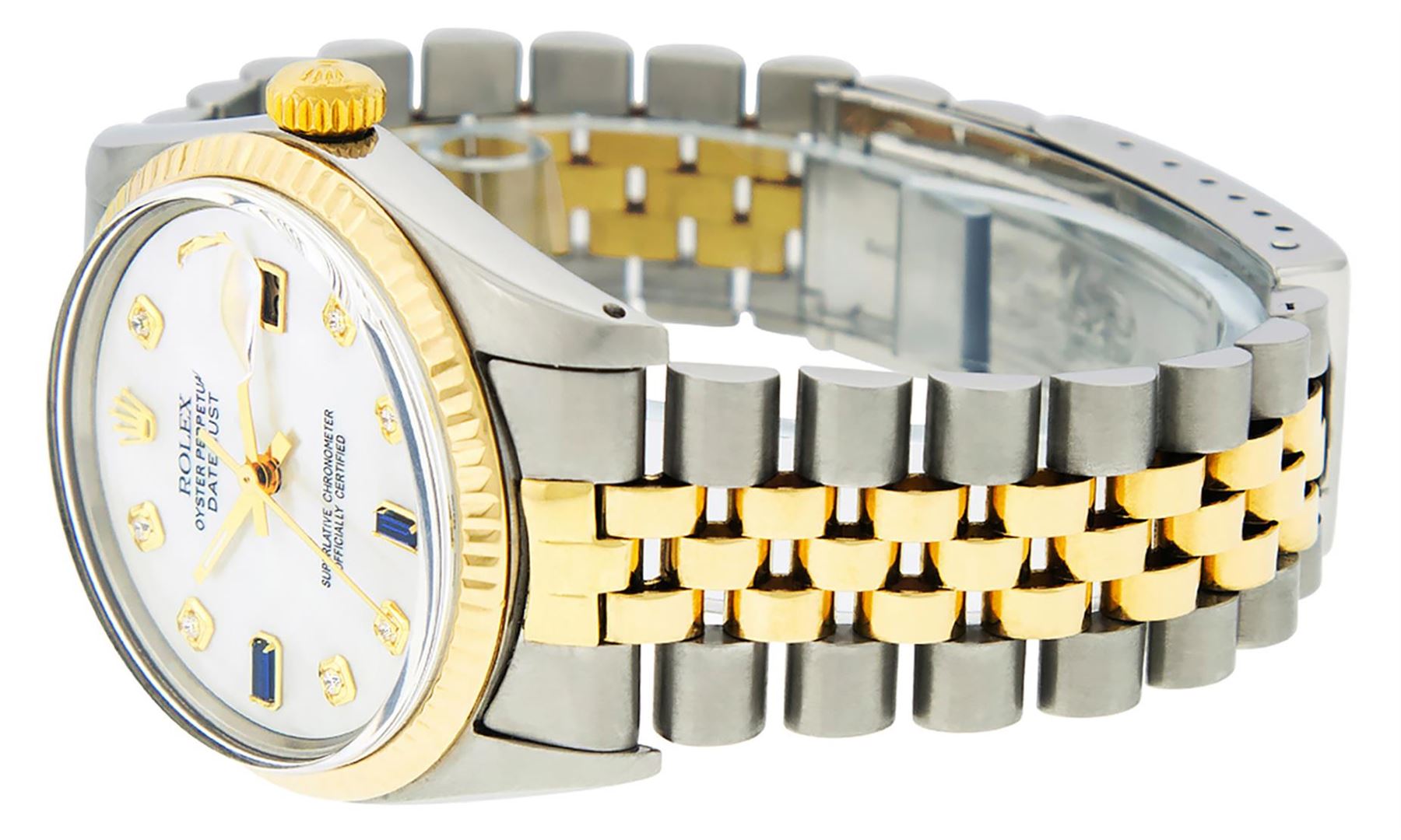 One Mens 14K Yellow Gold Two Tone Rolex Datejust Polished, Serviced & Electronically Tested, 14K Yellow Gold & Stainless Steel Case: 36mm, 14K Yellow Gold Crown, Bezel: 14K Yellow Gold Fluted Bezel. Custom Crystal: New Acrylic Cyclops Lens. Custom Hands: New Luminecent Hands. Movement: Automatic Winding Movement Caliber 3035. Custom Dial: Mother Of Pearl Diamond Dial, Stone Count: 8 Diamonds + 2 Synthetic Sapphire Baguettes in Dial, G To H In Color, SI-VS Clarity. Date Window: 3 O'Clock Position Date Display, Quickset, Model: 16013 Datejust. Condition: G-6 Extra Fine. Bracelet: Two Tone 14K Yellow Gold & Stainless Steel Jubilee. Bright Polish. 7.0 Inch Length, Adjustable. Standard Clasp, With Rolex Logo. This Watch Has Been Serviced And Polished It Is Free Of All Scratches And Dents.