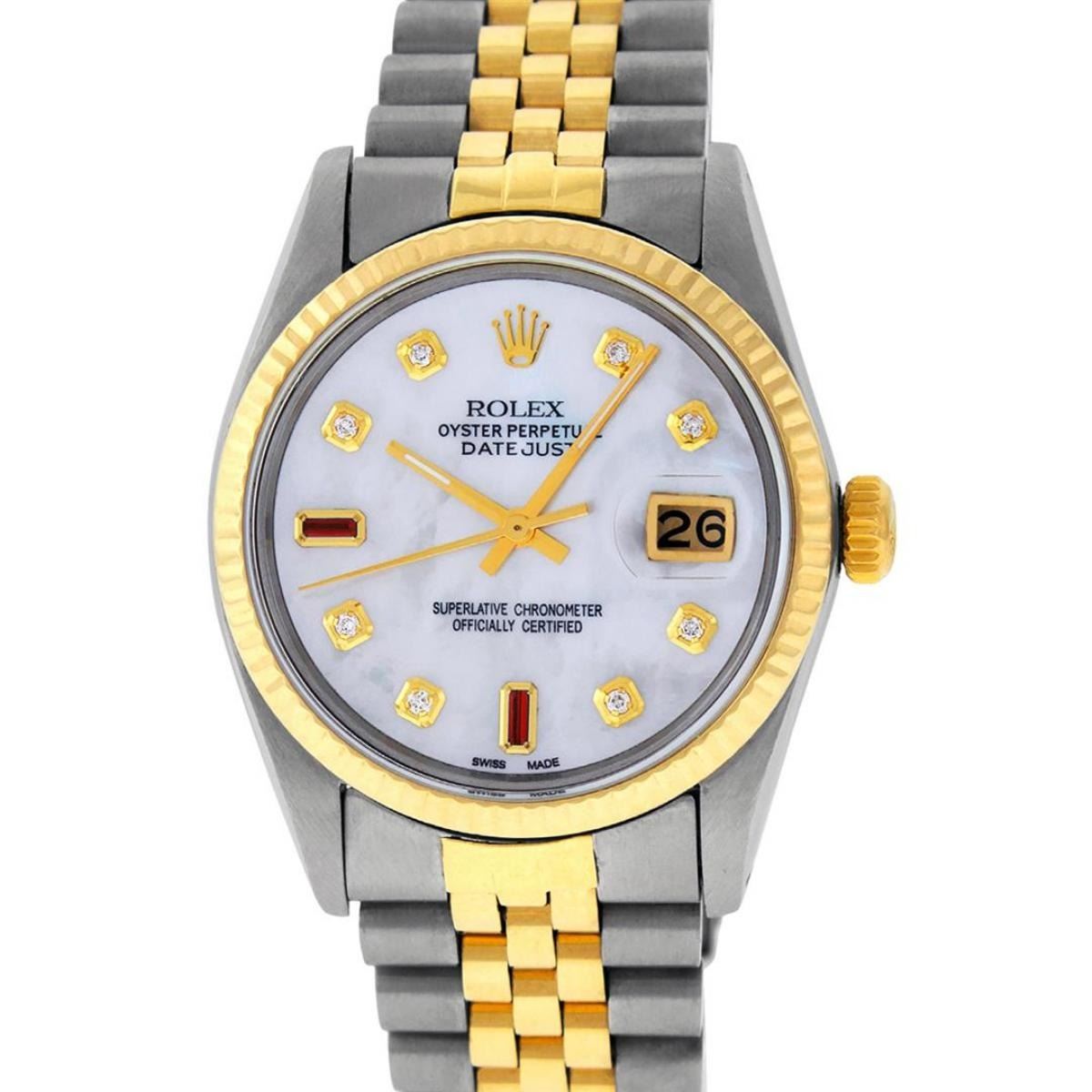 One Mens 14K Yellow Gold Two Tone Rolex Datejust Polished, Serviced & Electronically Tested, 14K Yellow Gold & Stainless Steel Case: 36mm, 14K Yellow Gold Crown,�Bezel: 14K Yellow Gold�Fluted Bezel. Custom Crystal: New Acrylic Cyclops Lens. Custom Hands: New Luminecent Hands. Movement: Automatic Winding Movement Caliber 3035. Custom Dial: Mother Of Pearl Diamond Dial,�Stone Count: 8 Diamonds + 2 Synthetic Ruby Baguettes�in Dial, G To H In Color, SI-VS Clarity. Date Window: 3 O'Clock Position Date Display,� Quickset, Model: 16013 Datejust. Condition: G-6 Extra Fine. Bracelet: Two Tone 14K Yellow Gold & Stainless Steel Jubilee. Bright Polish.�7.0 Inch Length, Adjustable. Standard Clasp, With Rolex Logo. This Watch Has Been Serviced And Polished It Is Free Of All Scratches And Dents.