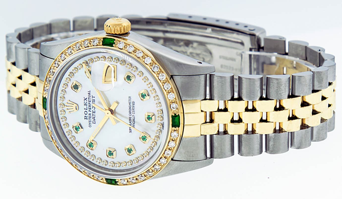One Mens 14K Yellow Gold Two Tone Rolex Datejust Polished, Serviced & Electronically Tested, 14K Yellow Gold & Stainless Steel Case: 36mm, 14K Yellow Gold Crown, Custom Bezel: 18K Yellow Gold Synthetic Emerald Beadset Diamond Bezel, Diamond Count: 36 Diamonds + 4 Synthetic Emeralds, Total Weight 1.0 Carat, Clarity: SI-VS, Color: G to H. Custom Crystal: New Synthetic Sapphire Cyclops Lens. Custom Hands: New Luminecent Hands. Movement: Automatic Winding Movement Caliber 3035. Custom Dial: Mother Of Pearl String Diamond Dial, Diamond Count: 48 Diamonds + 10 Emeralds, Color: G to H, Clairty: SI-VS Date Window: 3 O'Clock Position Date Display, Quickset, Model: 16013 Condition: G-6 Extra Fine. Bracelet: Two Tone 14K Yellow Gold & Stainless Steel Jubilee. Bright Polish. 7.0 Inch Length, Adjustable. Standard Clasp, With Rolex Logo. This Watch Has Been Serviced Time Tested And Is In Excellent Condition It Is Free Of All Scratches And Dents.