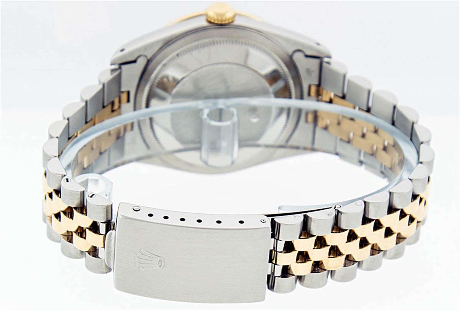 One Mens 14K Yellow Gold Two Tone Rolex Datejust Polished, Serviced & Electronically Tested, 14K Yellow Gold & Stainless Steel Case: 36mm, 14K Yellow Gold Crown, Custom Bezel: 18K Yellow Gold Synthetic Emerald Beadset Diamond Bezel, Diamond Count: 36 Diamonds + 4 Synthetic Emeralds, Total Weight 1.0 Carat, Clarity: SI-VS, Color: G to H. Custom Crystal: New Synthetic Sapphire Cyclops Lens. Custom Hands: New Luminecent Hands. Movement: Automatic Winding Movement Caliber 3035. Custom Dial: Mother Of Pearl String Diamond Dial, Diamond Count: 48 Diamonds + 10 Emeralds, Color: G to H, Clairty: SI-VS Date Window: 3 O'Clock Position Date Display, Quickset, Model: 16013 Condition: G-6 Extra Fine. Bracelet: Two Tone 14K Yellow Gold & Stainless Steel Jubilee. Bright Polish. 7.0 Inch Length, Adjustable. Standard Clasp, With Rolex Logo. This Watch Has Been Serviced Time Tested And Is In Excellent Condition It Is Free Of All Scratches And Dents.