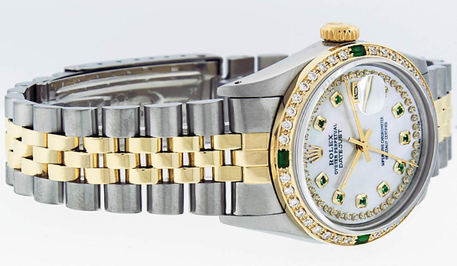One Mens 14K Yellow Gold Two Tone Rolex Datejust Polished, Serviced & Electronically Tested, 14K Yellow Gold & Stainless Steel Case: 36mm, 14K Yellow Gold Crown, Custom Bezel: 18K Yellow Gold Synthetic Emerald Beadset Diamond Bezel, Diamond Count: 36 Diamonds + 4 Synthetic Emeralds, Total Weight 1.0 Carat, Clarity: SI-VS, Color: G to H. Custom Crystal: New Synthetic Sapphire Cyclops Lens. Custom Hands: New Luminecent Hands. Movement: Automatic Winding Movement Caliber 3035. Custom Dial: Mother Of Pearl String Diamond  Dial, Diamond Count: 48 Diamonds + 10 Emeralds, Color: G to H, Clairty: SI-VS Date Window: 3 O'Clock Position Date Display,  Quickset, Model: 16013 Condition: G-6 Extra Fine. Bracelet: Two Tone 14K Yellow Gold & Stainless Steel Jubilee. Bright Polish. 7.0 Inch Length, Adjustable. Standard Clasp, With Rolex Logo. This Watch Has Been Serviced Time Tested And Is In Excellent Condition It Is Free Of All Scratches And Dents.