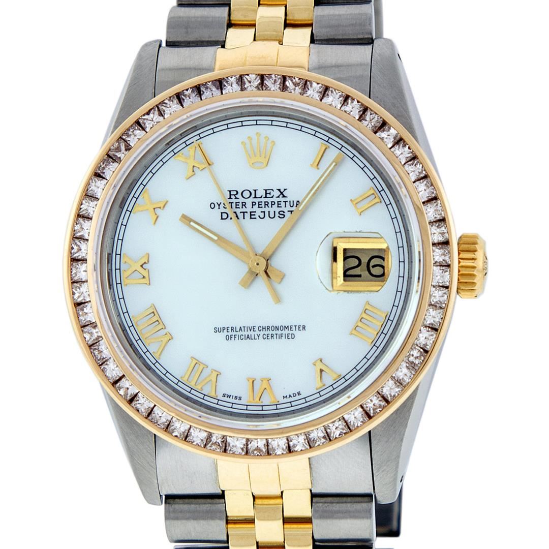 One Mens 14K Yellow Gold Two Tone Rolex Datejust Polished Bright with Satin Finish, Serviced & Electronically Tested, 14K Yellow Gold And Stainless Steel Case: 36mm, 14K Yellow Gold Crown, Custom Bezel: New 14K Yellow Gold Princess Cut Diamond Bezel, Diamond Count: 53 Diamonds, Total Weight 2.75 Carat, Clarity: SI-VS, Color: G to H. Custom Crystal: New Scratch Resistant Synthetic Sapphire Cyclops Lens. Custom Hands: New Luminecent Hands. Movement: Automatic Winding Movement Caliber 3035. Custom Dial: Mother Of Pearl Roman Dial With Square Track. Date Window: 3 O'Clock Position Date Display, Quickset, Model: 16013 Datejust. Condition: G-6 Extra Fine. Bracelet: 14K Yellow Gold And Stainless Steel Jubilee Band. Bright Polish & Satin Finish. 7.0 Inch Length, Adjustable. Standard Clasp, With Rolex Logo. This Watch Has Been Serviced and Polished And It Is Free Of All Dents And Scratches And Has Been Time Tested.