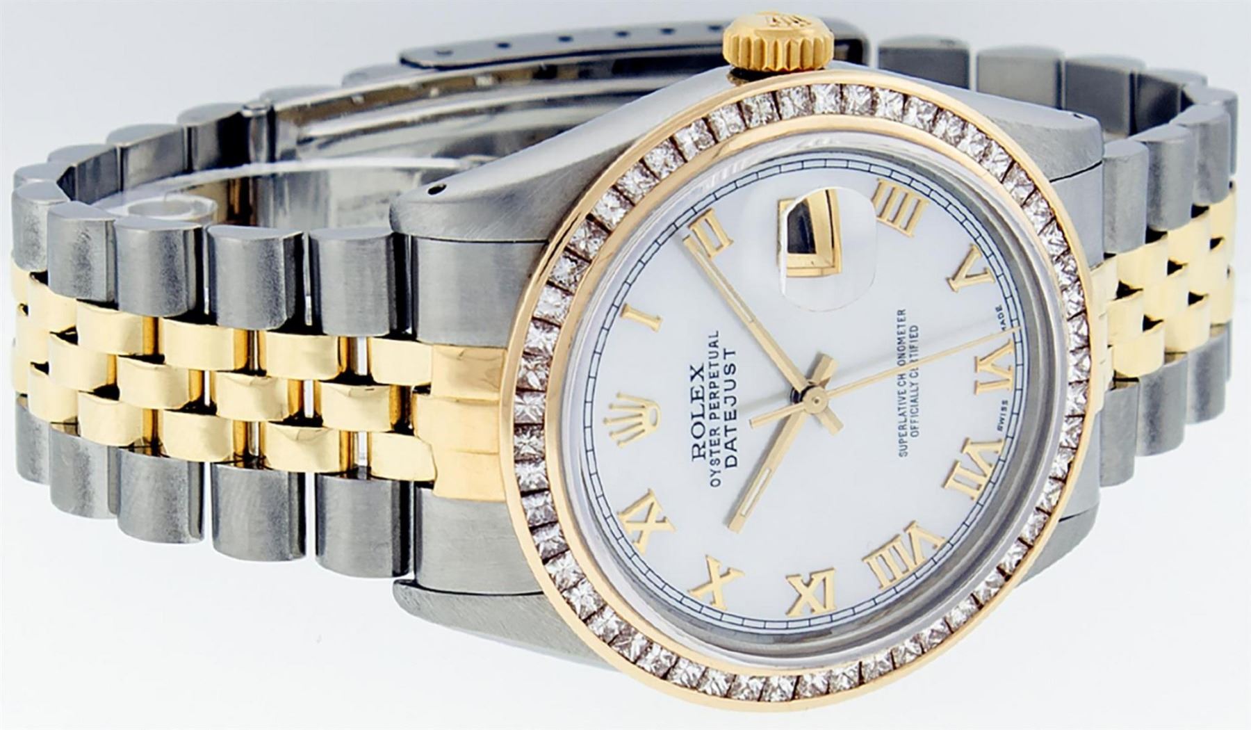 One Mens 14K Yellow Gold Two Tone Rolex Datejust Polished Bright with Satin Finish, Serviced & Electronically Tested, 14K Yellow Gold And Stainless Steel Case: 36mm, 14K Yellow Gold Crown, Custom Bezel: New 14K Yellow Gold Princess Cut Diamond Bezel, Diamond Count: 53 Diamonds, Total Weight 2.75 Carat, Clarity: SI-VS, Color: G to H. Custom Crystal: New Scratch Resistant Synthetic Sapphire Cyclops Lens. Custom Hands: New Luminecent Hands. Movement: Automatic Winding Movement Caliber 3035. Custom Dial: Mother Of Pearl Roman Dial With Square Track. Date Window: 3 O'Clock Position Date Display, Quickset, Model: 16013 Datejust. Condition: G-6 Extra Fine. Bracelet: 14K Yellow Gold And Stainless Steel Jubilee Band. Bright Polish & Satin Finish. 7.0 Inch Length, Adjustable. Standard Clasp, With Rolex Logo. This Watch Has Been Serviced and Polished And It Is Free Of All Dents And Scratches And Has Been Time Tested.
