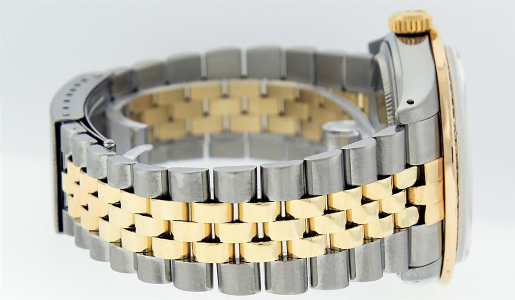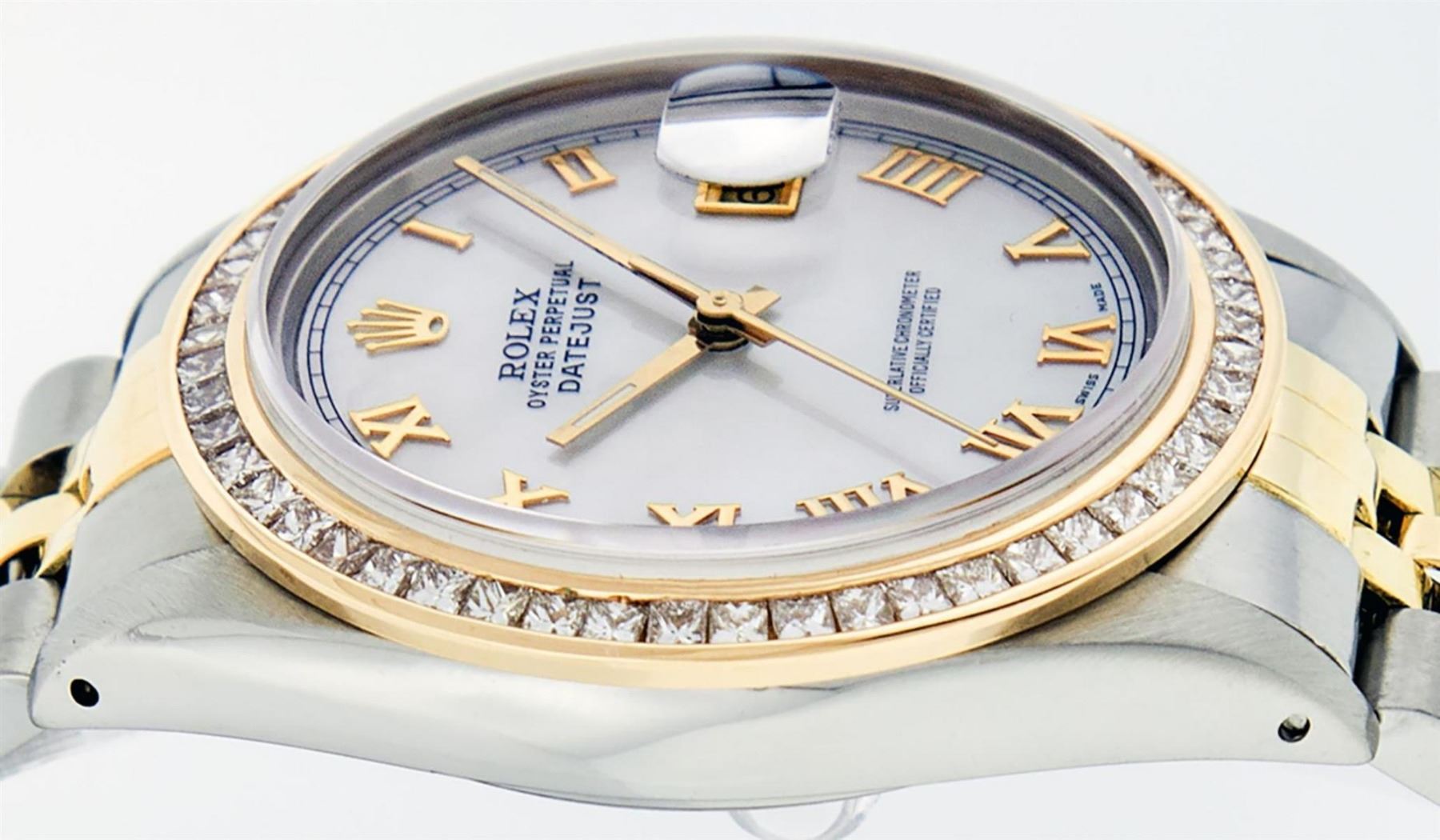One Mens 14K Yellow Gold Two Tone Rolex Datejust Polished Bright with Satin Finish, Serviced & Electronically Tested, 14K Yellow Gold And Stainless Steel Case: 36mm, 14K Yellow Gold Crown, Custom Bezel: New 14K Yellow Gold Princess Cut Diamond Bezel, Diamond Count: 53 Diamonds, Total Weight 2.75 Carat, Clarity: SI-VS, Color: G to H. Custom Crystal: New Scratch Resistant Synthetic Sapphire Cyclops Lens. Custom Hands: New Luminecent Hands. Movement: Automatic Winding Movement Caliber 3035. Custom Dial: Mother Of Pearl Roman Dial With Square Track. Date Window: 3 O'Clock Position Date Display, Quickset, Model: 16013 Datejust. Condition: G-6 Extra Fine. Bracelet: 14K Yellow Gold And Stainless Steel Jubilee Band. Bright Polish & Satin Finish. 7.0 Inch Length, Adjustable. Standard Clasp, With Rolex Logo. This Watch Has Been Serviced and Polished And It Is Free Of All Dents And Scratches And Has Been Time Tested.