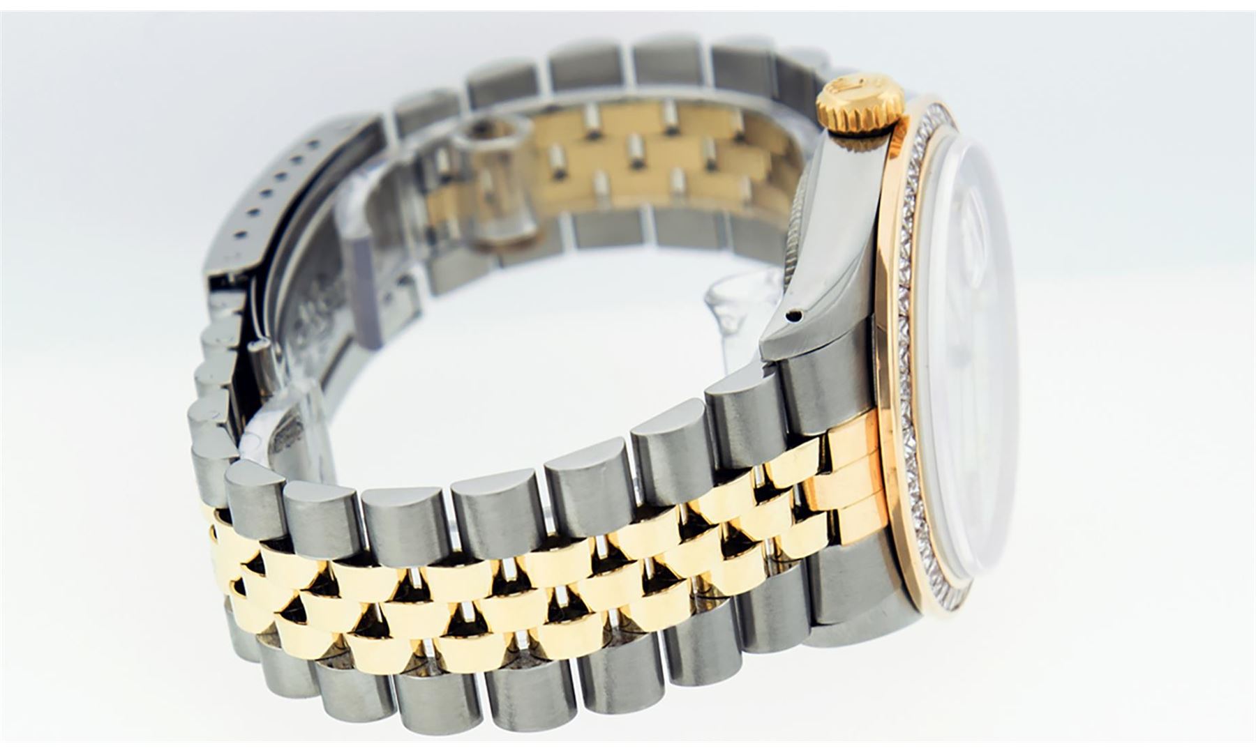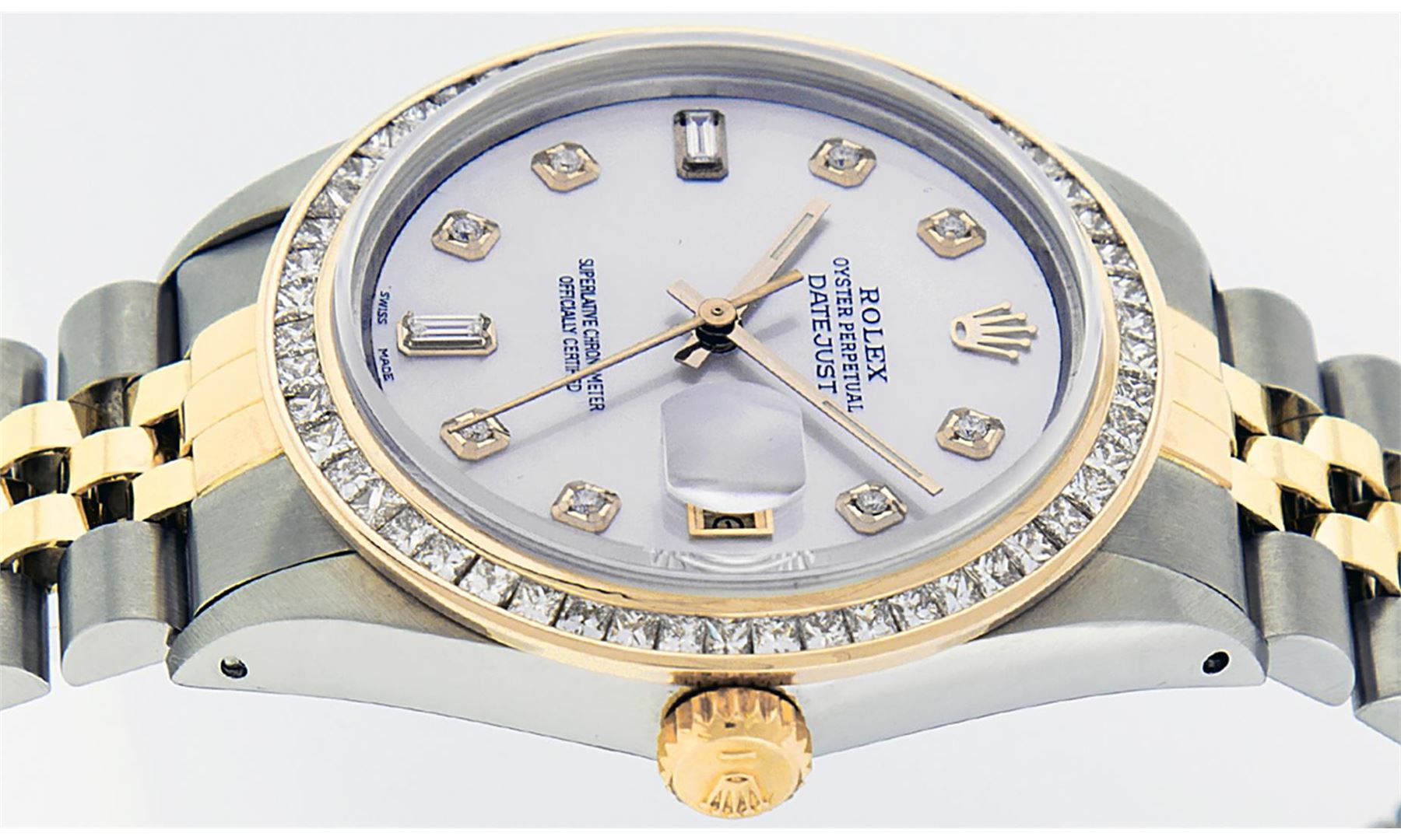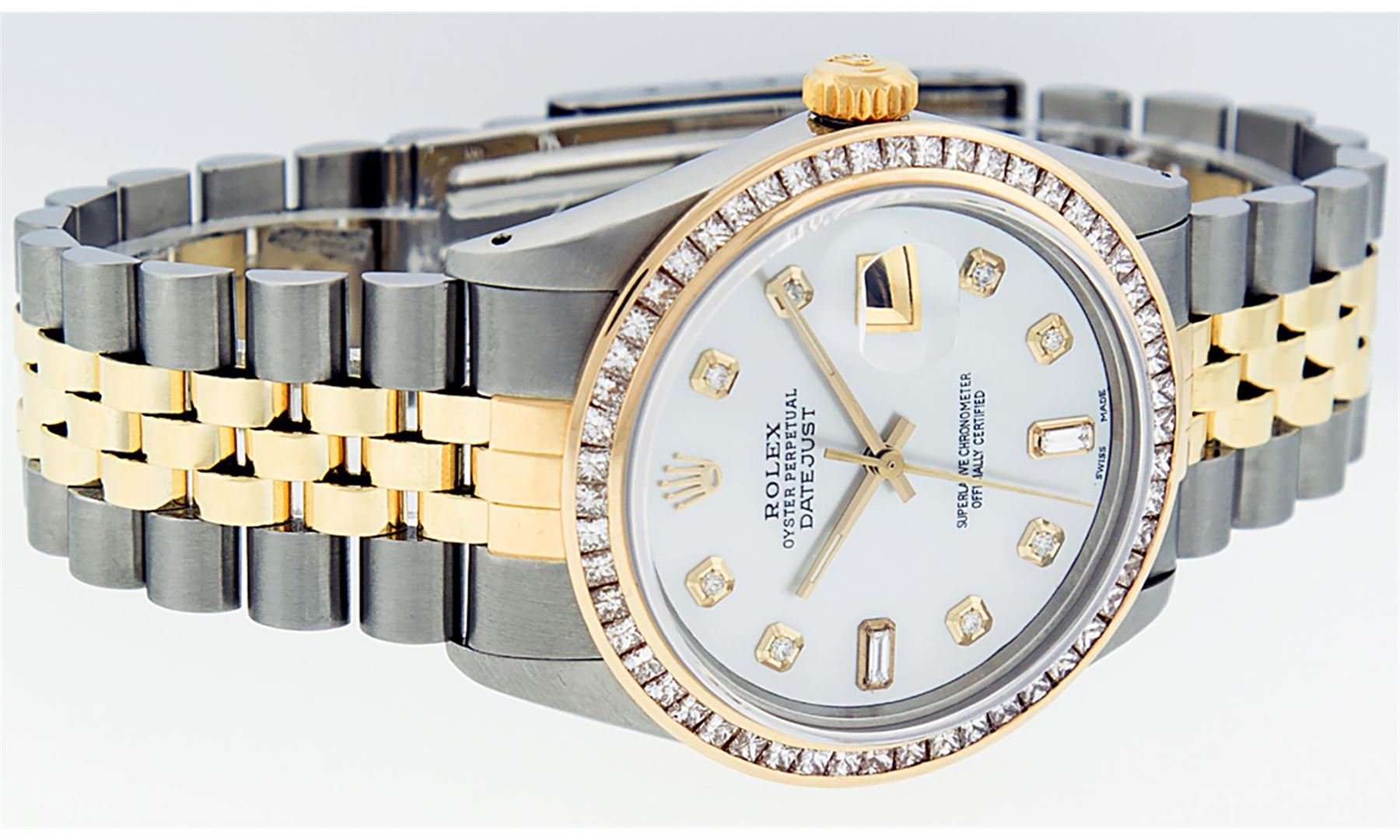 One Mens 14K Yellow Gold Two Tone Rolex Datejust Polished Bright with Satin Finish, Serviced & Electronically Tested, 14K Yellow Gold And Stainless Steel Case: 36mm, 14K Yellow Gold Crown, Custom Bezel: New 14K Yellow Gold Princess Cut Diamond Bezel, Diamond Count: 53 Diamonds In Bezel, Total Weight 2.75 Carat, Clarity: SI-VS, Color: G to H. Custom Crystal: New Scratch Resistant Synthetic Sapphire Cyclops Lens. Custom Hands: New Luminecent Hands. Movement: Automatic Winding Movement Caliber 3035. Custom Dial: Mother Of Pearl 8 + 2 Diamond Dial, Diamond Count: 8 + 2 Baguette Diamonds in Dial, Dial Color: G To H In Color, Clarity: VS2. Date Window: 3 O'Clock Position Date Display, Quickset, Model: 16013 Datejust. Condition: G-6 Extra Fine. Bracelet: 14K Yellow Gold And Stainless Steel Jubilee Band. Bright Polish & Satin Finish. 7.0 Inch Length, Adjustable. Standard Clasp, With Rolex Logo. This Watch Has Been Serviced and Polished And It Is Free Of All Dents And Scratches And Has Been Time Tested.