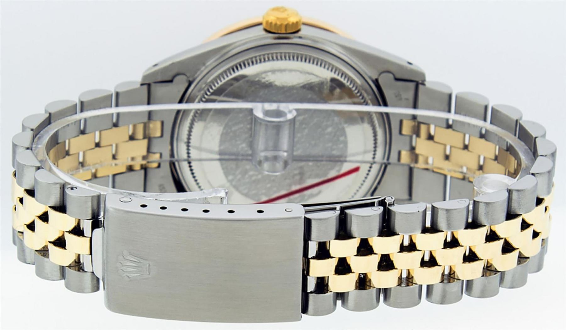 One Mens 14K Yellow Gold Two Tone Rolex Datejust Polished Bright with Satin Finish, Serviced & Electronically Tested, 14K Yellow Gold And Stainless Steel Case: 36mm, 14K Yellow Gold Crown, Custom Bezel: New 14K Yellow Gold Princess Cut Diamond Bezel, Diamond Count: 53 Diamonds In Bezel, Total Weight 2.75 Carat, Clarity: SI-VS, Color: G to H. Custom Crystal: New Scratch Resistant Synthetic Sapphire Cyclops Lens. Custom Hands: New Luminecent Hands. Movement: Automatic Winding Movement Caliber 3035. Custom Dial: Mother Of Pearl 8 + 2 Diamond Dial, Diamond Count: 8 + 2 Baguette Diamonds in Dial, Dial Color: G To H In Color, Clarity: VS2. Date Window: 3 O'Clock Position Date Display, Quickset, Model: 16013 Datejust. Condition: G-6 Extra Fine. Bracelet: 14K Yellow Gold And Stainless Steel Jubilee Band. Bright Polish & Satin Finish. 7.0 Inch Length, Adjustable. Standard Clasp, With Rolex Logo. This Watch Has Been Serviced and Polished And It Is Free Of All Dents And Scratches And Has Been Time Tested.