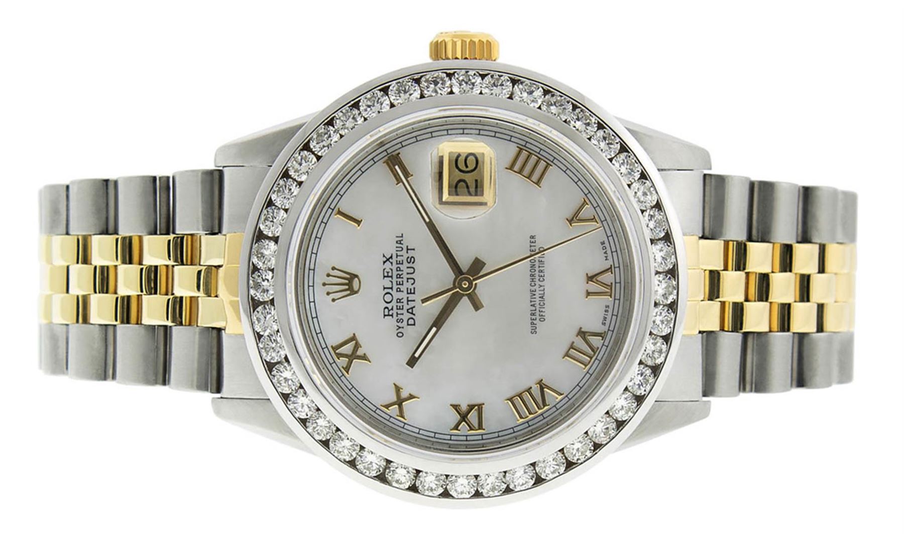 One Mens 14K Yellow Gold Rolex Datejust Polished Bright with Satin Finish, Serviced & Electronically Tested, Stainless Steel Case: 36mm, Yellow Gold Crown, Custom Bezel: 18K White Gold 3ct Channel Set Diamond Bezel, Diamond Count: 40 Diamonds, Total Weight 3.00 Carat, Clarity: SI-VS, Color: G to H. Custom Crystal: New Synthetic Sapphire Cyclops Lens. Custom Hands: New Luminecent Hands. Movement: Automatic Winding Movement Caliber 3035. Custom Dial: White Roman Dial With Square Track. Date Window: 3 O'Clock Position Date Display, Quickset, Model: 16013 Datejust Condition: G-6 Extra Fine. Bracelet: 14K Yellow Gold And Stainless Steel Jubilee Band. Bright Polish & Satin Finish. 7.0 Inch Length, Adjustable. Standard Clasp, With Rolex Logo. This Watch Has Been Serviced And Polished It Is Free Of All Scratches And Dents.