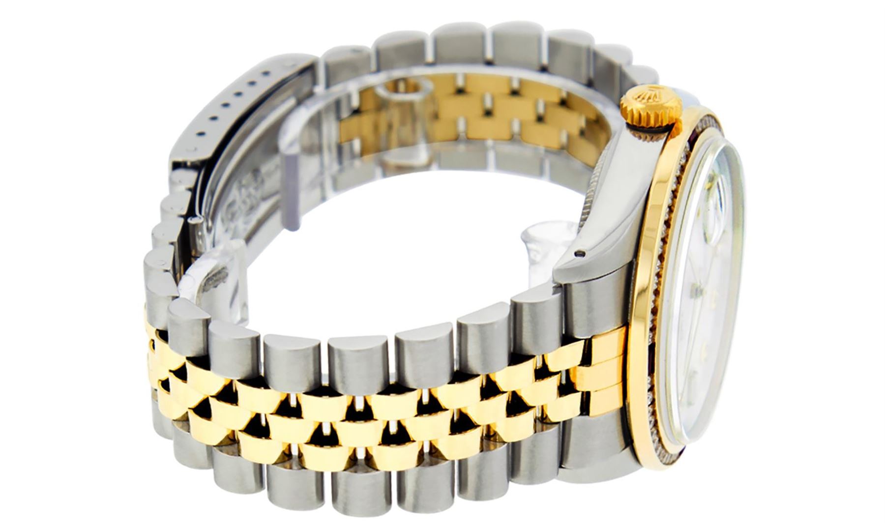 One Mens 14K Yellow Gold Two Tone Rolex Datejust Polished, Serviced & Electronically Tested, 14K Yellow Gold & Stainless Steel Case: 36mm, 14K Yellow Gold Crown, Custom Bezel: 18K Yellow Gold Ruby Channel Set Diamond Bezel, Diamond Count: 52 Diamonds + 4 Rubies, Total Weight 1.30 Carat, Clarity: SI-VS, Color: G to H. Custom Crystal: New Scratch Resistant Synthetic Sapphire Cyclops Lens. Custom Hands: New Luminecent Hands. Movement: Automatic Winding Movement Caliber 3035. Custom Dial: Mother Of Pearl Diamond Dial, Stone Count: 8 Diamonds + 2 Baguette Diamonds In Dial. Date Window: 3 O'Clock Position Date Display, Quickset, Model: 16013 Condition: G-6 Extra Fine. Bracelet: Two Tone 14K Yellow Gold & Stainless Steel Jubilee. Bright Polish. 7.0 Inch Length, Adjustable. Standard Clasp, With Rolex Logo. This Watch Has Been Serviced Time Tested And Is In Excellent Condition It Is Free Of All Scratches And Dents.