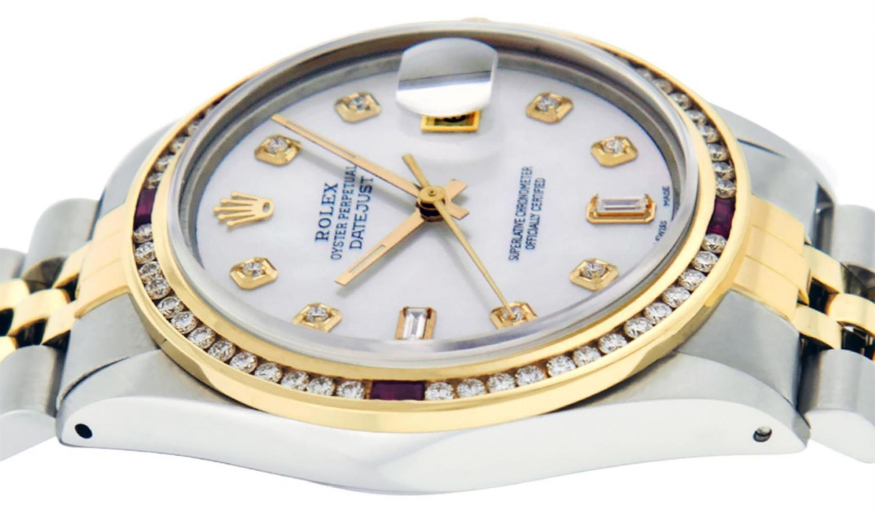 One Mens 14K Yellow Gold Two Tone Rolex Datejust Polished, Serviced & Electronically Tested, 14K Yellow Gold & Stainless Steel Case: 36mm, 14K Yellow Gold Crown, Custom Bezel: 18K Yellow Gold Ruby Channel Set Diamond Bezel, Diamond Count: 52 Diamonds + 4 Rubies, Total Weight 1.30 Carat, Clarity: SI-VS, Color: G to H. Custom Crystal: New Scratch Resistant Synthetic Sapphire Cyclops Lens. Custom Hands: New Luminecent Hands. Movement: Automatic Winding Movement Caliber 3035. Custom Dial: Mother Of Pearl Diamond Dial, Stone Count: 8 Diamonds + 2 Baguette Diamonds In Dial. Date Window: 3 O'Clock Position Date Display,�Quickset, Model: 16013 Condition: G-6 Extra Fine. Bracelet: Two Tone 14K Yellow Gold & Stainless Steel Jubilee. Bright Polish.�7.0 Inch Length, Adjustable. Standard Clasp, With Rolex Logo. This Watch Has Been Serviced Time Tested And Is In Excellent Condition It Is Free Of All Scratches And Dents.