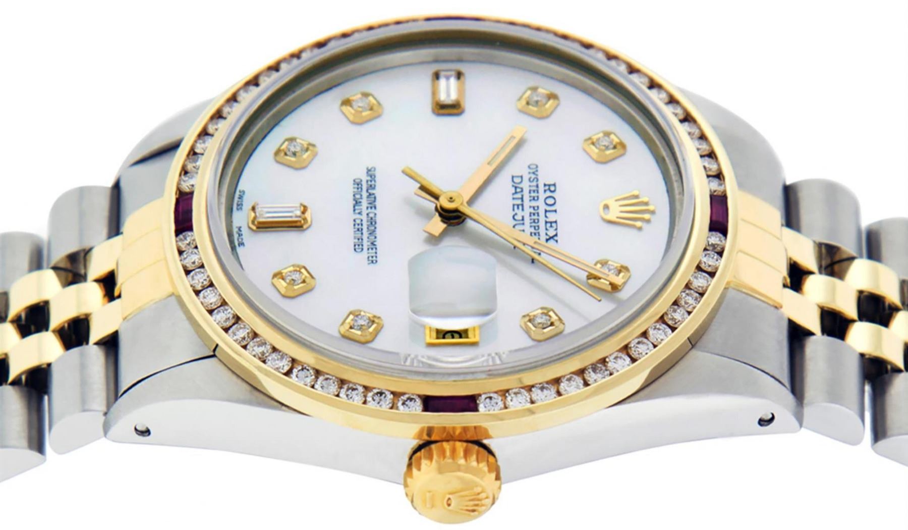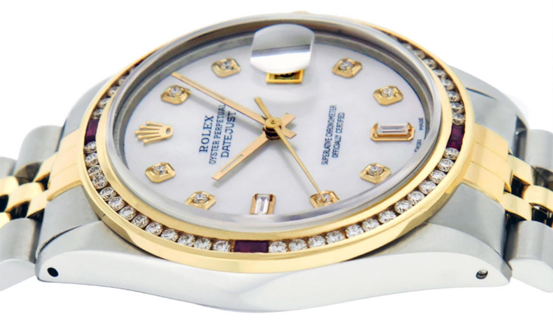 One Mens 14K Yellow Gold Two Tone Rolex Datejust Polished, Serviced & Electronically Tested, 14K Yellow Gold & Stainless Steel Case: 36mm, 14K Yellow Gold Crown, Custom Bezel: 18K Yellow Gold Ruby Channel Set Diamond Bezel, Diamond Count: 52 Diamonds + 4 Rubies, Total Weight 1.30 Carat, Clarity: SI-VS, Color: G to H. Custom Crystal: New Scratch Resistant Synthetic Sapphire Cyclops Lens. Custom Hands: New Luminecent Hands. Movement: Automatic Winding Movement Caliber 3035. Custom Dial: Mother Of Pearl Diamond Dial, Stone Count: 8 Diamonds + 2 Baguette Diamonds In Dial. Date Window: 3 O'Clock Position Date Display, Quickset, Model: 16013 Condition: G-6 Extra Fine. Bracelet: Two Tone 14K Yellow Gold & Stainless Steel Jubilee. Bright Polish. 7.0 Inch Length, Adjustable. Standard Clasp, With Rolex Logo. This Watch Has Been Serviced Time Tested And Is In Excellent Condition It Is Free Of All Scratches And Dents.