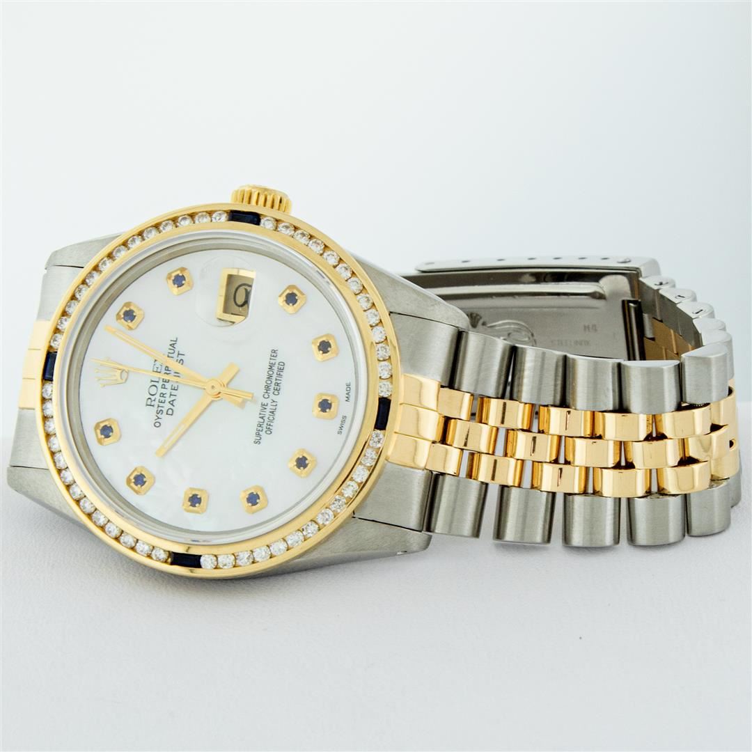 One Mens 14K Yellow Gold Two Tone Rolex Datejust Polished, Serviced & Electronically Tested, 14K Yellow Gold & Stainless Steel Case: 36mm, 14K Yellow Gold Crown, Custom Bezel: 18K Yellow Gold Sapphire Channel Set Diamond Bezel, Diamond Count: 52 Diamonds + 4 Sapphires, Total Weight 1.30 Carat, Clarity: SI-VS, Color: G to H. Custom Crystal: New Synthetic Sapphire Cyclops Lens. Custom Hands: New Hands. Movement: Automatic Winding Movement Caliber 3035. Custom Dial: Mother Of Pearl Dial With Sapphire Hour Markers, Stone Count: 10 Sapphires in Dial. Date Window: 3 O'Clock Position Date Display,�Quickset, Model: 16013 Condition: G-6 Extra Fine. Bracelet: Two Tone 14K Yellow Gold & Stainless Steel Jubilee. Bright Polish.�7.0 Inch Length, Adjustable. Standard Clasp, With Rolex Logo. This Watch Has Been Serviced Time Tested And Is In Excellent Condition It Is Free Of All Scratches And Dents. This Watch Comes With An Appraisal And Rolex Watch Box.