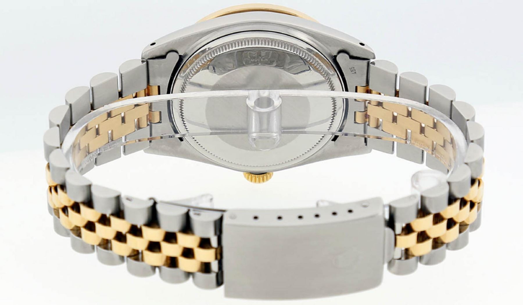 One Mens 14K Yellow Gold Two Tone Rolex Datejust Polished, Serviced & Electronically Tested, 14K Yellow Gold & Stainless Steel Case: 36mm, 14K Yellow Gold Crown, Custom Bezel: 18K Yellow Gold Sapphire Channel Set Diamond Bezel, Diamond Count: 52 Diamonds + 4 Sapphires, Total Weight 1.30 Carat, Clarity: SI-VS, Color: G to H. Custom Crystal: New Synthetic Sapphire Cyclops Lens. Custom Hands: New Hands. Movement: Automatic Winding Movement Caliber 3035. Custom Dial: Mother Of Pearl Dial With Sapphire Hour Markers, Stone Count: 10 Sapphires in Dial. Date Window: 3 O'Clock Position Date Display,�Quickset, Model: 16013 Condition: G-6 Extra Fine. Bracelet: Two Tone 14K Yellow Gold & Stainless Steel Jubilee. Bright Polish.�7.0 Inch Length, Adjustable. Standard Clasp, With Rolex Logo. This Watch Has Been Serviced Time Tested And Is In Excellent Condition It Is Free Of All Scratches And Dents.