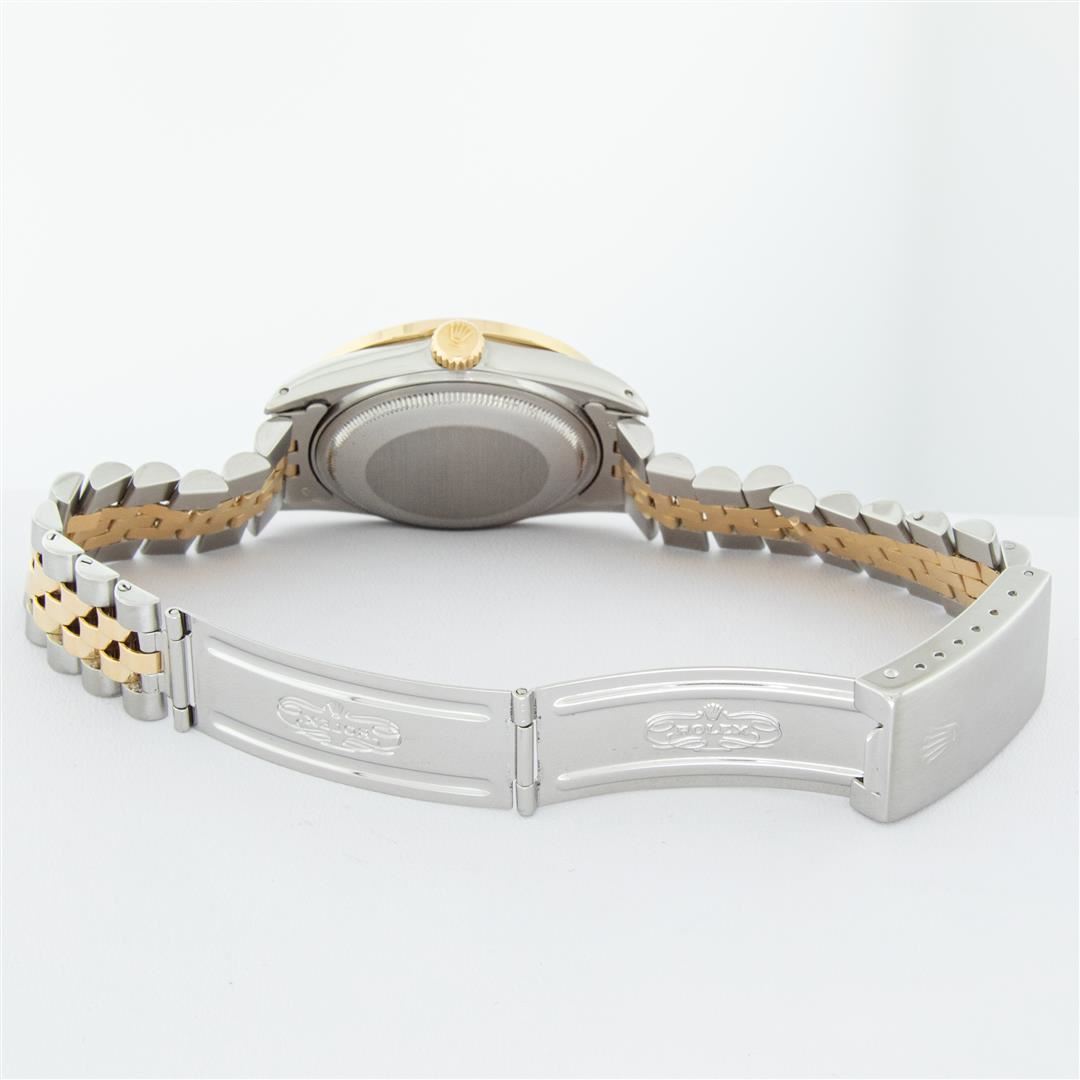 One Mens 14K Yellow Gold Two Tone Rolex Datejust Polished, Serviced & Electronically Tested, 14K Yellow Gold & Stainless Steel Case: 36mm, 14K Yellow Gold Crown, Custom Bezel: 18K Yellow Gold Sapphire Channel Set Diamond Bezel, Diamond Count: 52 Diamonds + 4 Sapphires, Total Weight 1.30 Carat, Clarity: SI-VS, Color: G to H. Custom Crystal: New Synthetic Sapphire Cyclops Lens. Custom Hands: New Hands. Movement: Automatic Winding Movement Caliber 3035. Custom Dial: Mother Of Pearl Dial With Sapphire Hour Markers, Stone Count: 10 Sapphires in Dial. Date Window: 3 O'Clock Position Date Display, Quickset, Model: 16013 Condition: G-6 Extra Fine. Bracelet: Two Tone 14K Yellow Gold & Stainless Steel Jubilee. Bright Polish. 7.0 Inch Length, Adjustable. Standard Clasp, With Rolex Logo. This Watch Has Been Serviced Time Tested And Is In Excellent Condition It Is Free Of All Scratches And Dents. This Watch Comes With An Appraisal And Rolex Watch Box.