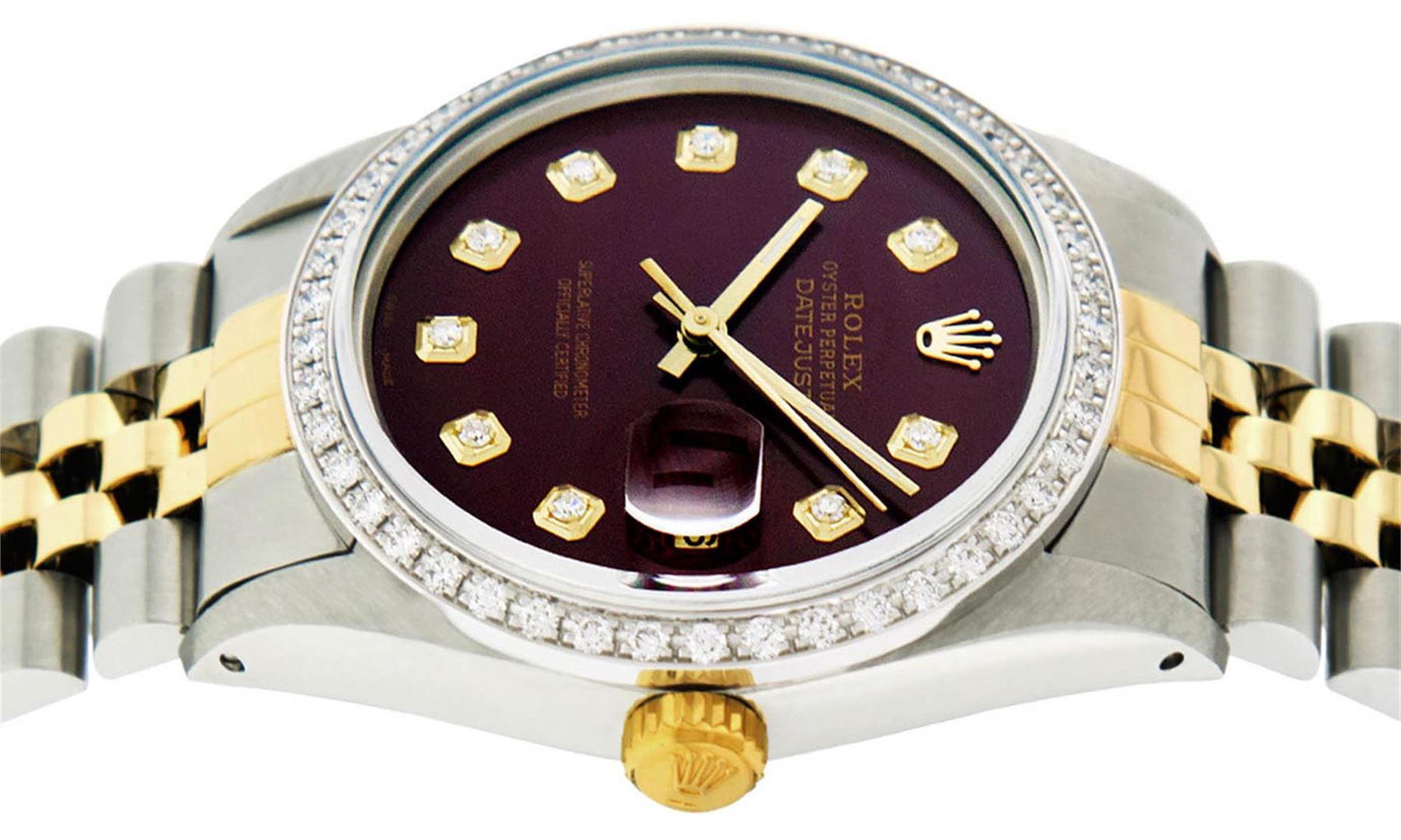 One Mens 14K Yellow Gold Two Tone Rolex Datejust Polished, Serviced & Electronically Tested, 18K Yellow Gold & Stainless Steel Case: 36mm, 18K Yellow Gold Crown, Custom Bezel: New 18K White Gold Beadset Diamond Bezel, Diamond Count: 44 Diamonds, Total Weight 1.00 Carat, Clarity: SI-VS, Color: G to H. Crystal: New Synthetic Sapphire Cyclops Lens. Custom Hands: New Luminecent Hands. Movement: Automatic Winding Movement Caliber 3035. Custom Dial: Maroon Diamond, Diamond Count: 10 Diamonds in Dial G To H In Color, Clarity: VS, Date Window: 3 O'Clock Position Date Display, Quickset, Model: 16013 Condition: G-6 Extra Fine. Bracelet: Two Tone 14K Yellow Gold & Stainless Steel Jubilee. Bright Polish. 7.0 Inch Length, Adjustable. Standard Clasp, With Rolex Logo. This Watch Has Been Serviced Time Tested And Is In Excellent Condition It Is Free Of All Scratches And Dents.