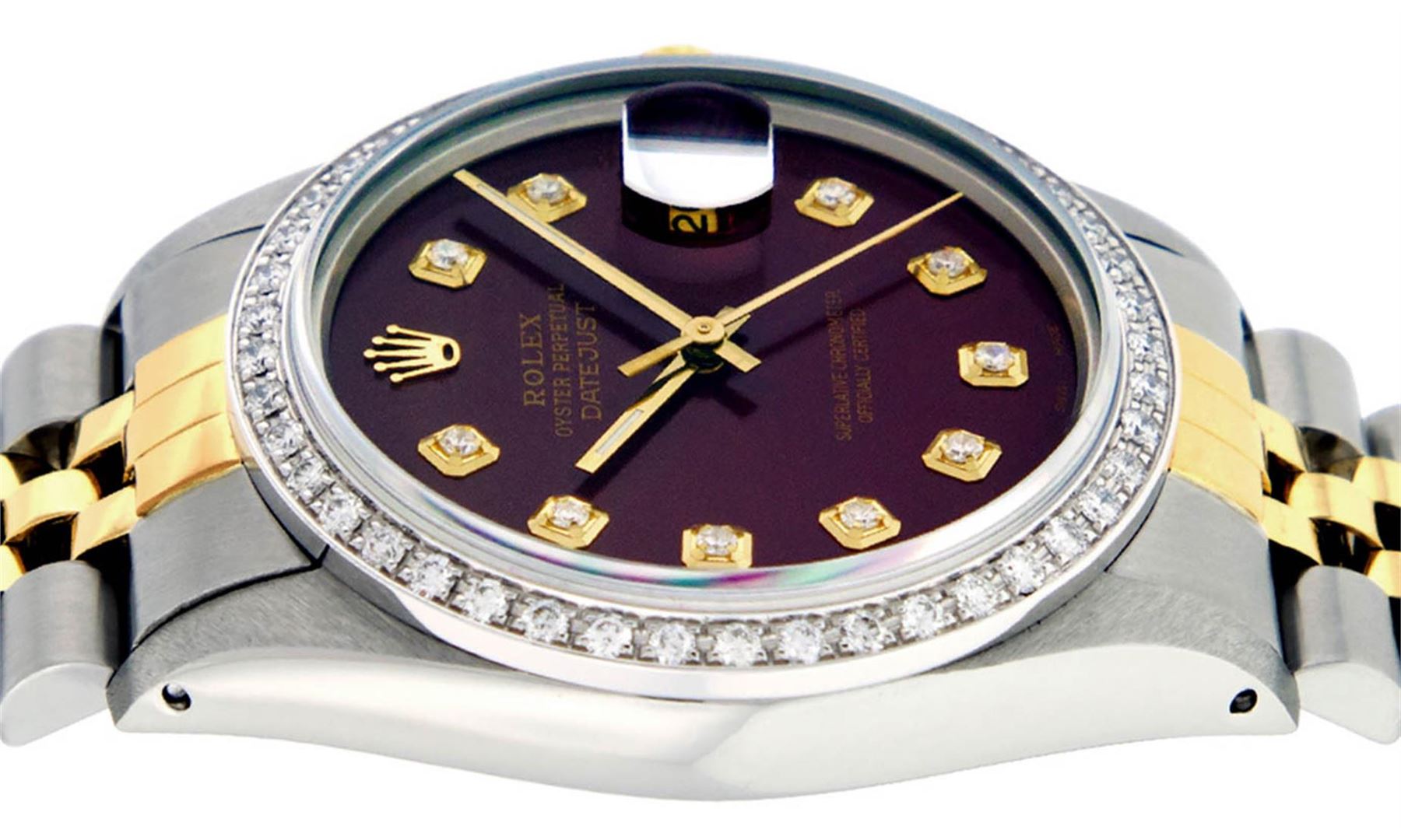 One Mens 14K Yellow Gold Two Tone Rolex Datejust Polished, Serviced & Electronically Tested, 18K Yellow Gold & Stainless Steel Case: 36mm, 18K Yellow Gold Crown, Custom Bezel: New 18K White Gold Beadset Diamond Bezel, Diamond Count: 44 Diamonds, Total Weight 1.00 Carat, Clarity: SI-VS, Color: G to H. Crystal: New Synthetic Sapphire Cyclops Lens. Custom Hands: New Luminecent Hands. Movement: Automatic Winding Movement Caliber 3035. Custom Dial: Maroon Diamond, Diamond Count: 10 Diamonds in Dial G To H In Color, Clarity: VS, Date Window: 3 O'Clock Position Date Display, Quickset, Model: 16013 Condition: G-6 Extra Fine. Bracelet: Two Tone 14K Yellow Gold & Stainless Steel Jubilee. Bright Polish. 7.0 Inch Length, Adjustable. Standard Clasp, With Rolex Logo. This Watch Has Been Serviced Time Tested And Is In Excellent Condition It Is Free Of All Scratches And Dents.