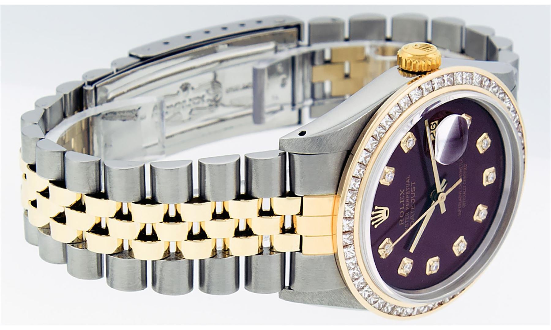 One Mens 14K Yellow Gold Two Tone Rolex Datejust Polished Bright with Satin Finish, Serviced & Electronically Tested, 14K Yellow Gold And Stainless Steel Case: 36mm, 14K Yellow Gold Crown, Custom Bezel: New 14K Yellow Gold Princess Cut Diamond Bezel, Diamond Count: 53 Diamonds, Total Weight 2.75 Carat, Clarity: SI-VS, Color: G to H. Custom Crystal: New Scratch Resistant Synthetic Sapphire Cyclops Lens. Custom Hands: New Luminecent Hands. Movement: Automatic Winding Movement Caliber 3035. Custom Dial: Maroon Single Cut Diamond Dial, Diamond Count: 10 Diamonds in Dial, Dial Color: G To H In Color, Clarity: VS2. Date Window: 3 O'Clock Position Date Display, Quickset, Model: Datejust. Condition: G-6 Extra Fine. Bracelet: 14K Yellow Gold And Stainless Steel Jubilee. Bright Polish & Satin Finish. 7.0 Inch Length, Adjustable. Standard Clasp, With Rolex Logo. This Watch Has Been Serviced and Polished And It Is Free Of All Dents And Scratches And Has Been Time Tested.