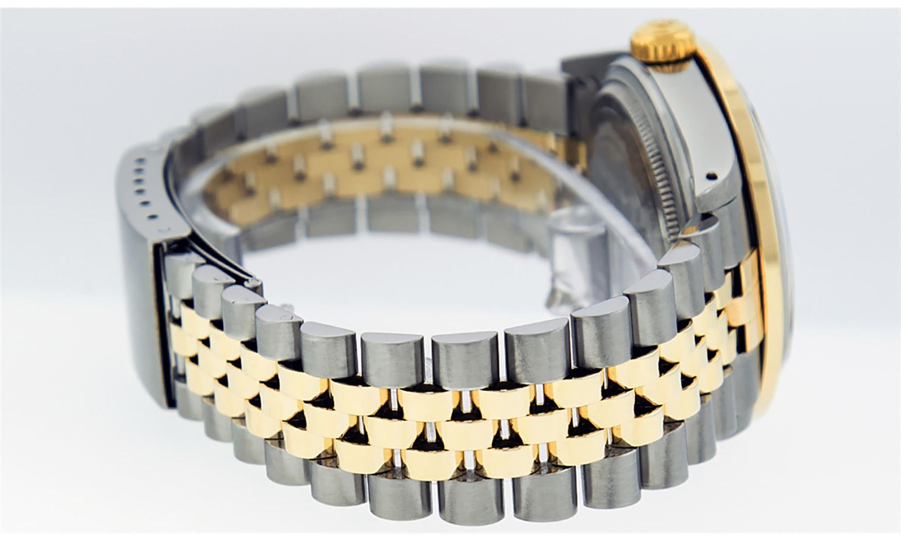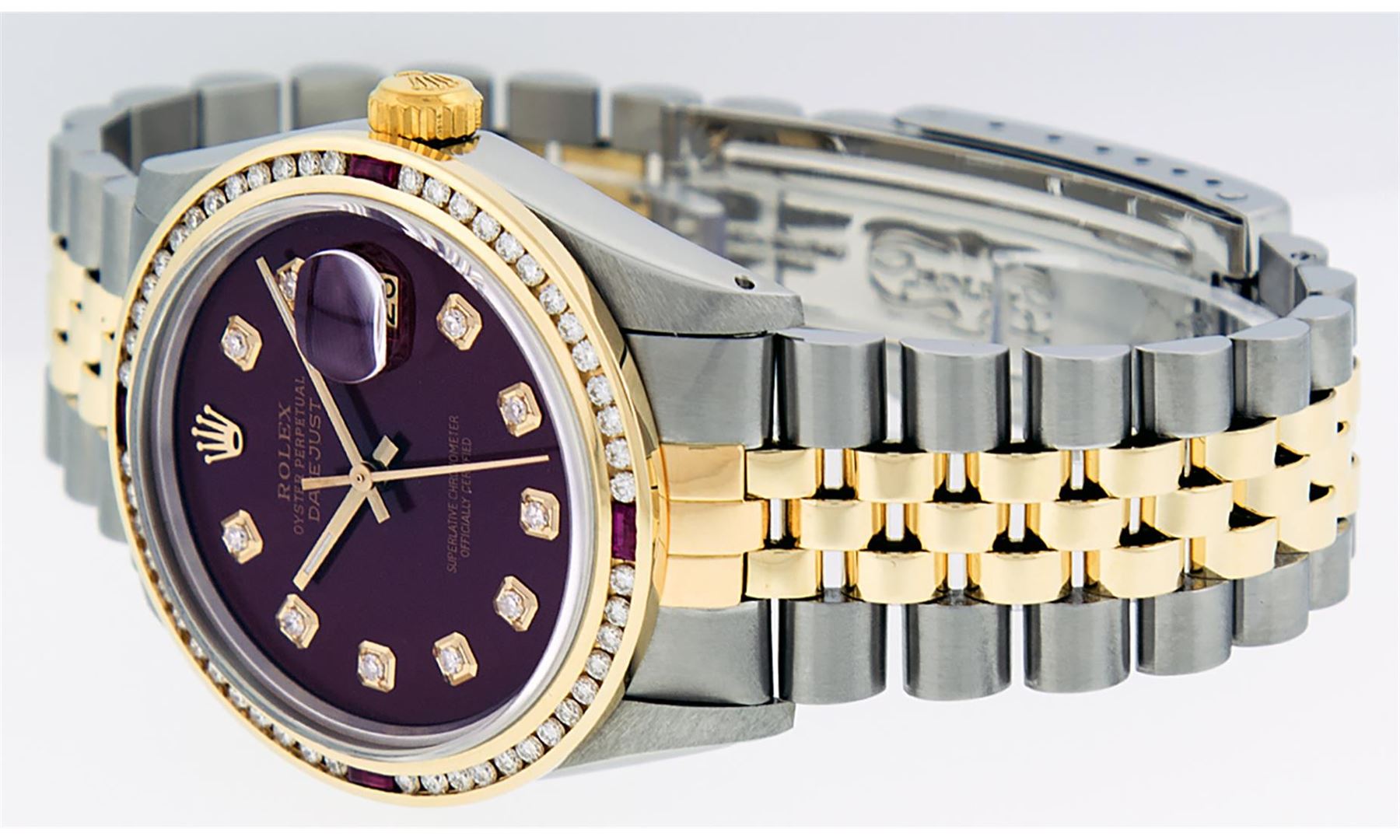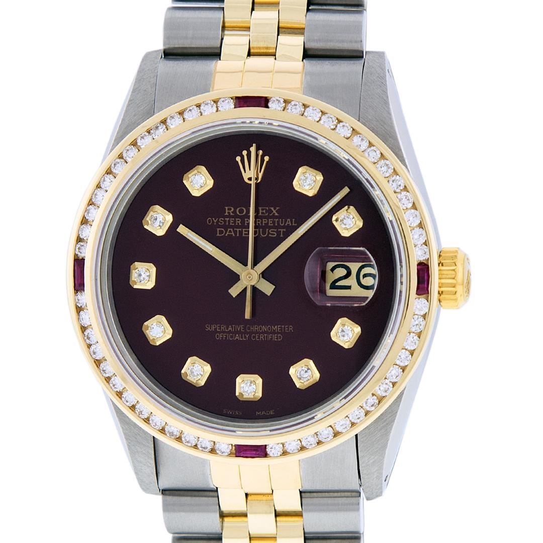 One Mens 14K Yellow Gold Two Tone Rolex Datejust Polished, Serviced & Electronically Tested, 14K Yellow Gold & Stainless Steel Case: 36mm, 14K Yellow Gold Crown, Custom Bezel: 18K Yellow Gold Ruby Channel Set Diamond Bezel, Diamond Count: 52 Diamonds + 4 Rubies, Total Weight 1.30 Carat, Clarity: SI-VS, Color: G to H. Custom Crystal: New Scratch Resistant Synthetic Sapphire Cyclops Lens. Custom Hands: New Luminecent Hands. Movement: Automatic Winding Movement Caliber 3035. Custom Dial: Maroon Diamond Dial With Single Cut Diamonds, Diamond Count: 10 Diamonds in Dial. Date Window: 3 O'Clock Position Date Display, Quickset, Model: 16013 Datejust. Condition: G-6 Extra Fine. Bracelet:Two Tone 14K Yellow Gold & Stainless Steel Jubilee Band. Bright Polish. 7.0 Inch Length, Adjustable. Standard Clasp, With Rolex Logo. This Watch Has Been Serviced Time Tested And Is In Excellent Condition It Is Free Of All Scratches And Dents.