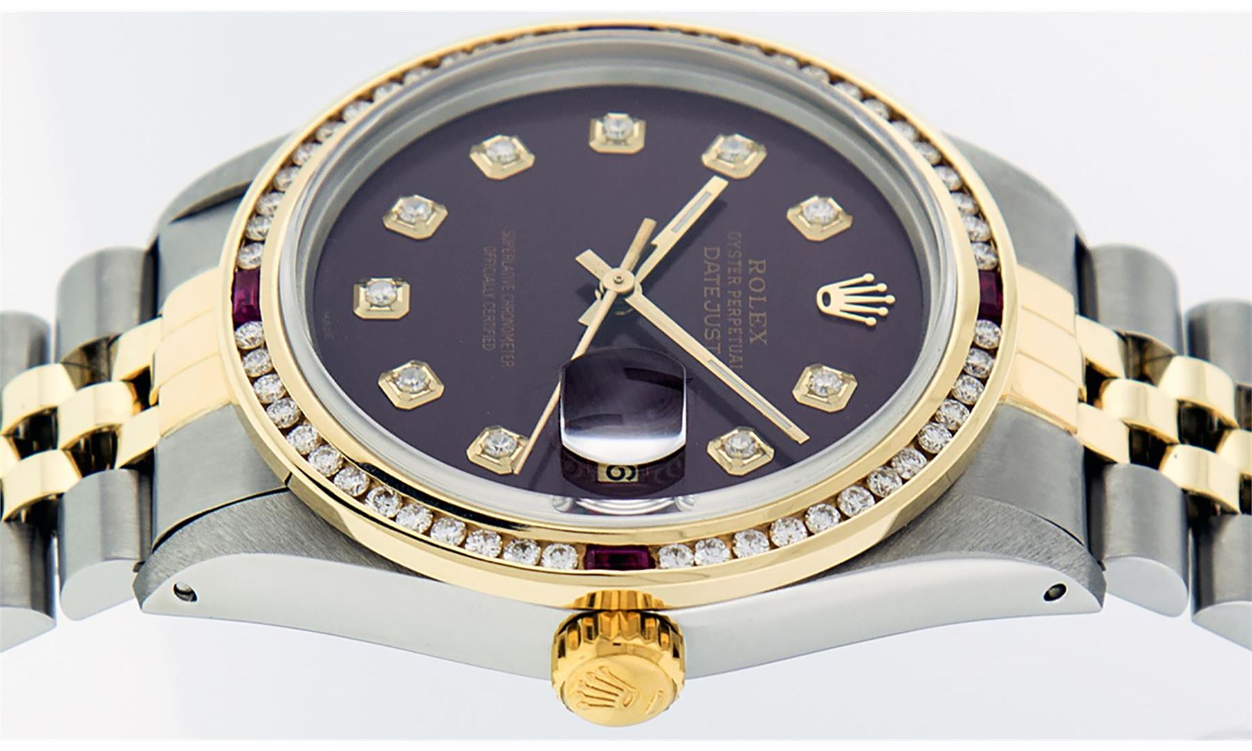 One Mens 14K Yellow Gold Two Tone Rolex Datejust Polished, Serviced & Electronically Tested, 14K Yellow Gold & Stainless Steel Case: 36mm, 14K Yellow Gold Crown, Custom Bezel: 18K Yellow Gold Ruby Channel Set Diamond Bezel, Diamond Count: 52 Diamonds + 4 Rubies, Total Weight 1.30 Carat, Clarity: SI-VS, Color: G to H. Custom Crystal: New Scratch Resistant Synthetic Sapphire Cyclops Lens. Custom Hands: New Luminecent Hands. Movement: Automatic Winding Movement Caliber 3035. Custom Dial: Maroon Diamond Dial With Single Cut Diamonds, Diamond Count: 10 Diamonds in Dial. Date Window: 3 O'Clock Position Date Display, Quickset, Model: 16013 Datejust. Condition: G-6 Extra Fine. Bracelet:Two Tone 14K Yellow Gold & Stainless Steel Jubilee Band. Bright Polish. 7.0 Inch Length, Adjustable. Standard Clasp, With Rolex Logo. This Watch Has Been Serviced Time Tested And Is In Excellent Condition It Is Free Of All Scratches And Dents.