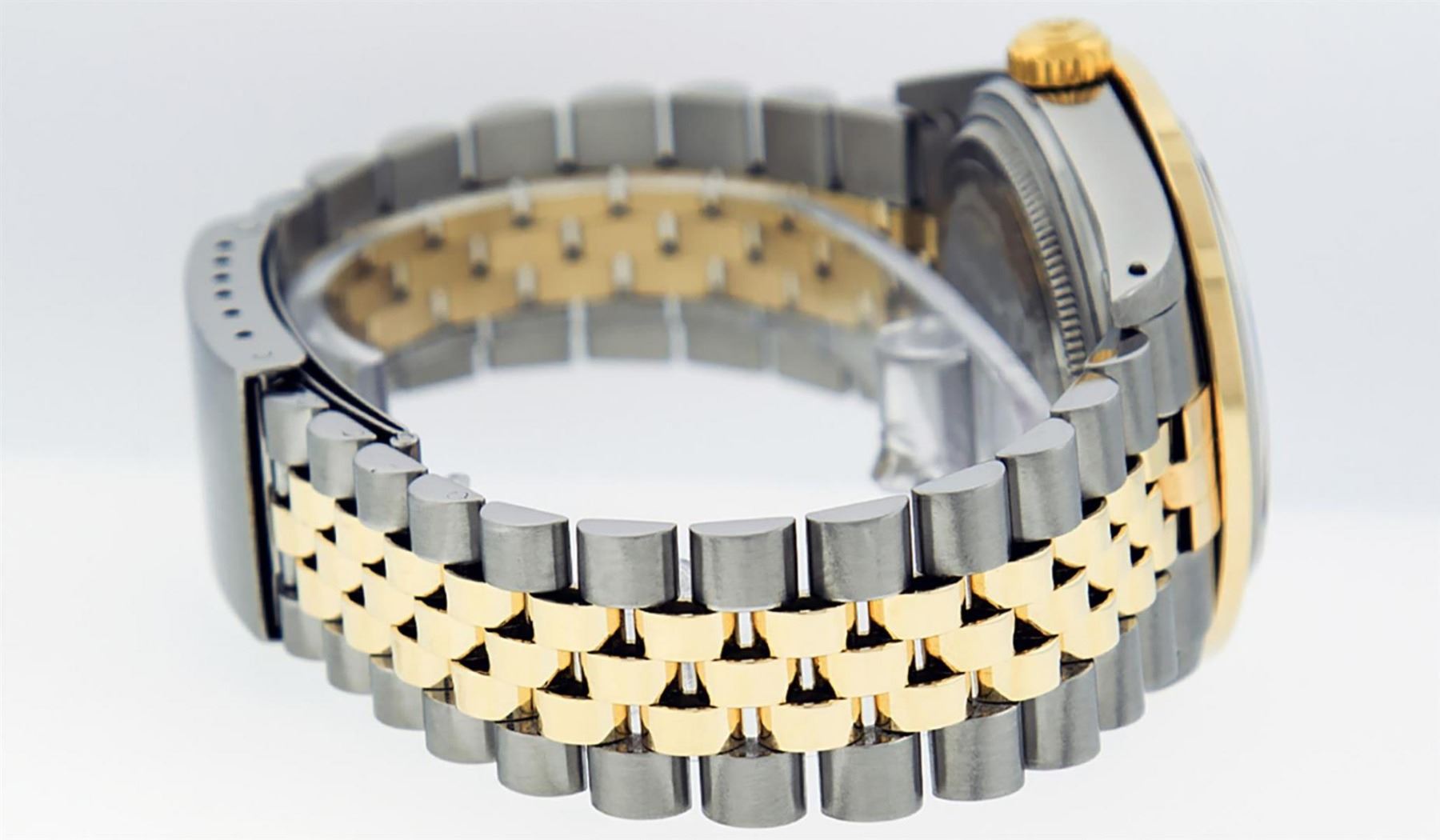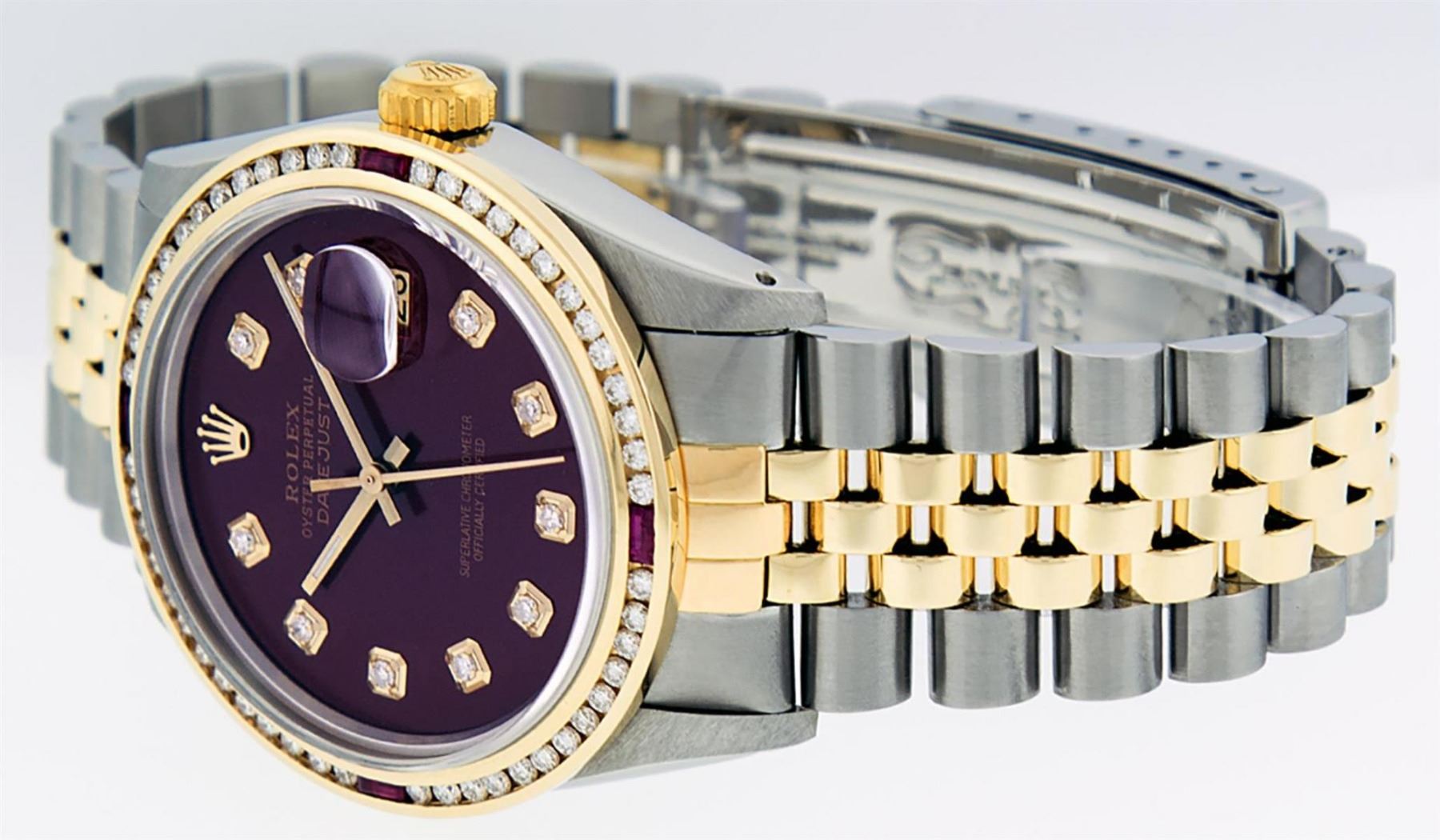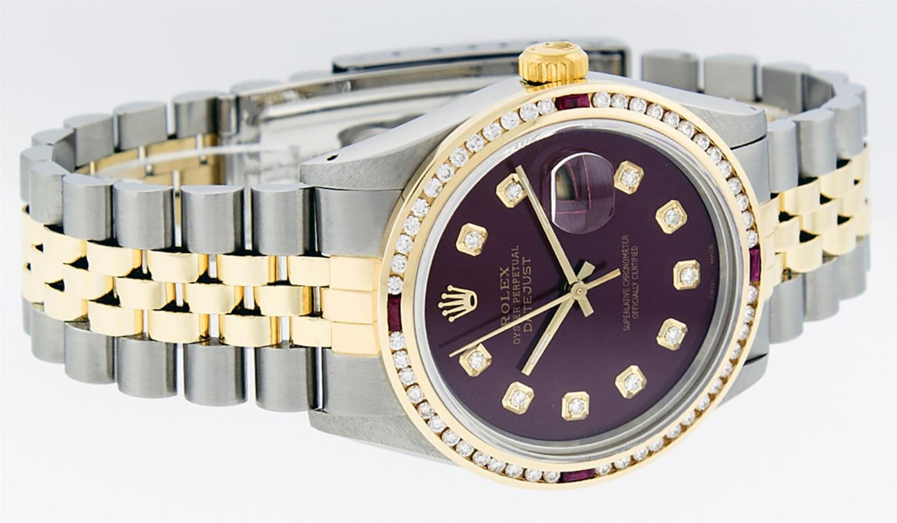 One Mens 14K Yellow Gold Two Tone Rolex Datejust Polished, Serviced & Electronically Tested, 14K Yellow Gold & Stainless Steel Case: 36mm, 14K Yellow Gold Crown, Custom Bezel: 18K Yellow Gold Ruby Channel Set Diamond Bezel, Diamond Count: 52 Diamonds + 4 Rubies, Total Weight 1.30 Carat, Clarity: SI-VS, Color: G to H. Custom Crystal: New Scratch Resistant Synthetic Sapphire Cyclops Lens. Custom Hands: New Luminecent Hands. Movement: Automatic Winding Movement Caliber 3035. Custom Dial: Maroon Diamond Dial With Single Cut Diamonds, Diamond Count: 10 Diamonds in Dial. Date Window: 3 O'Clock Position Date Display, Quickset, Model: 16013 Datejust. Condition: G-6 Extra Fine. Bracelet:Two Tone 14K Yellow Gold & Stainless Steel Jubilee Band. Bright Polish. 7.0 Inch Length, Adjustable. Standard Clasp, With Rolex Logo. This Watch Has Been Serviced Time Tested And Is In Excellent Condition It Is Free Of All Scratches And Dents.