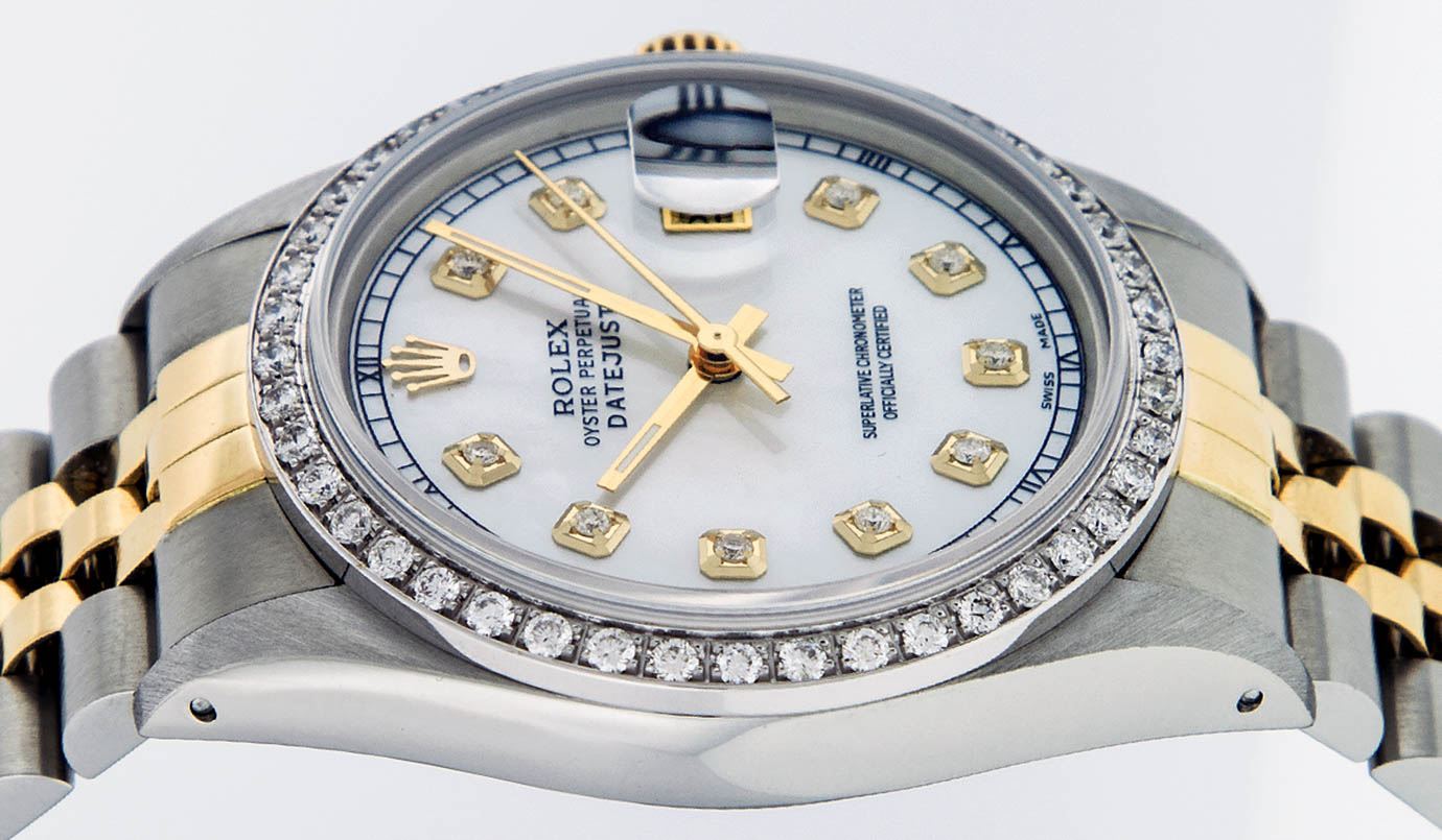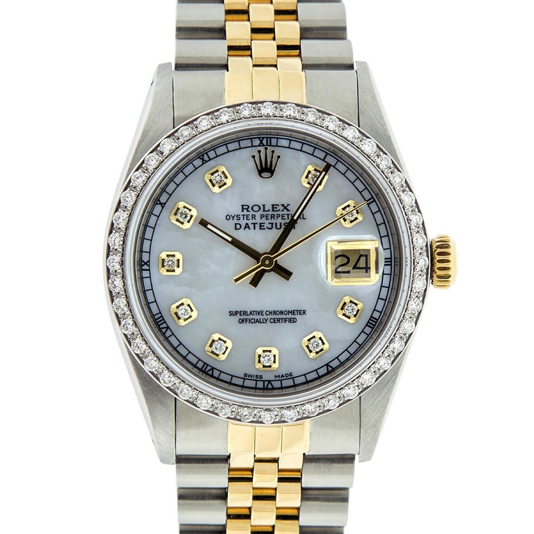 One Mens 14K Yellow Gold Two Tone Rolex Datejust Polished, Serviced & Electronically Tested, 14K Yellow Gold & Stainless Steel Case: 36mm, 14K Yellow Gold Crown, Custom Bezel: 18K White Gold Beadset Diamond Bezel, Diamond Count: 44 Diamonds, Total Weight 1.00 Carat, Clarity: SI-VS, Color: G to H. Custom Crystal: New Synthetic Sapphire Cyclops Lens. Custom Hands: New Luminecent Hands. Movement: Automatic Winding Movement Caliber 3035. Custom Dial: Mother Of Pearl Diamond Dial, 10 Diamonds in Dial G To H In Color, SI-VS Clarity, Date Window: 3 O'Clock Position Date Display, Quickset, Model: 16013 Datejust. Condition: G-6 Extra Fine. Bracelet:Two Tone 14K Yellow Gold & Stainless Steel Jubilee. Bright Polish. 7.0 Inch Length, Adjustable. Standard Clasp, With Rolex Logo. This Watch Has Been Serviced Time Tested And Is In Excellent Condition It Is Free Of All Scratches And Dents.