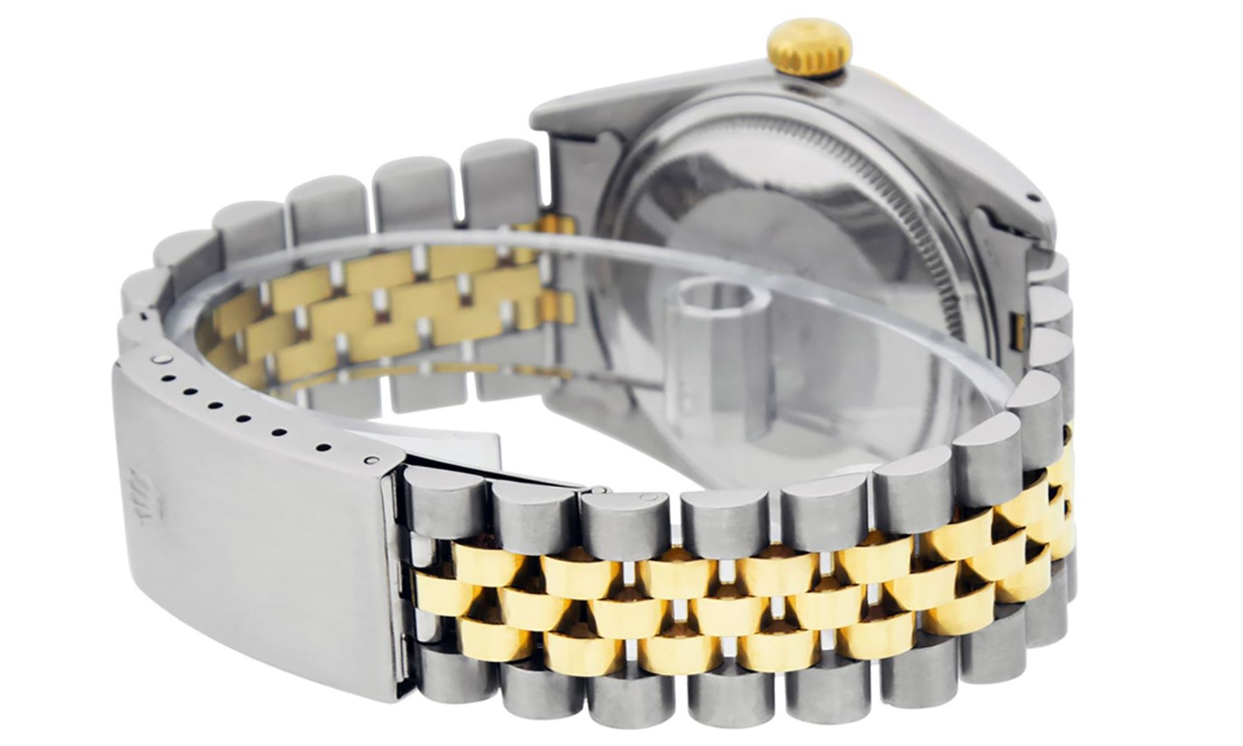 One Mens 14K Yellow Gold Two Tone Rolex Datejust Polished, Serviced & Electronically Tested, 14K Yellow Gold & Stainless Steel Case: 36mm, 14K Yellow Gold Crown, Bezel: 14K Yellow Gold Fluted Bezel. Custom Crystal: New Acrylic Cyclops Lens. Custom Hands: New Luminecent Hands. Movement: Automatic Winding Movement Caliber 3035. Custom Dial: Mother Of Pearl Diamond Dial, Stone Count: 8 Diamonds + 2 Synthetic Emerald Baguettes in Dial, G To H In Color, SI-VS Clarity. Date Window: 3 O'Clock Position Date Display, Quickset, Model: 16013 Datejust. Condition: G-6 Extra Fine. Bracelet: Two Tone 14K Yellow Gold & Stainless Steel Jubilee. Bright Polish. 7.0 Inch Length, Adjustable. Standard Clasp, With Rolex Logo. This Watch Has Been Serviced And Polished It Is Free Of All Scratches And Dents.