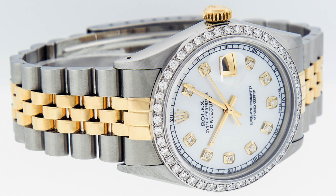 One Mens 14K Yellow Gold Two Tone Rolex Datejust Polished, Serviced & Electronically Tested, 14K Yellow Gold & Stainless Steel Case: 36mm, 14K Yellow Gold Crown, Custom Bezel: 18K White Gold Beadset Diamond Bezel, Diamond Count: 44 Diamonds, Total Weight 1.00 Carat, Clarity: SI-VS, Color: G to H. Custom Crystal: New Synthetic Sapphire Cyclops Lens. Custom Hands: New Luminecent Hands. Movement: Automatic Winding Movement Caliber 3035. Custom Dial: Mother Of Pearl Diamond Dial, 10 Diamonds in Dial G To H In Color, SI-VS Clarity, Date Window: 3 O'Clock Position Date Display, Quickset, Model: 16013 Datejust. Condition: G-6 Extra Fine. Bracelet:Two Tone 14K Yellow Gold & Stainless Steel Jubilee. Bright Polish. 7.0 Inch Length, Adjustable. Standard Clasp, With Rolex Logo. This Watch Has Been Serviced Time Tested And Is In Excellent Condition It Is Free Of All Scratches And Dents.