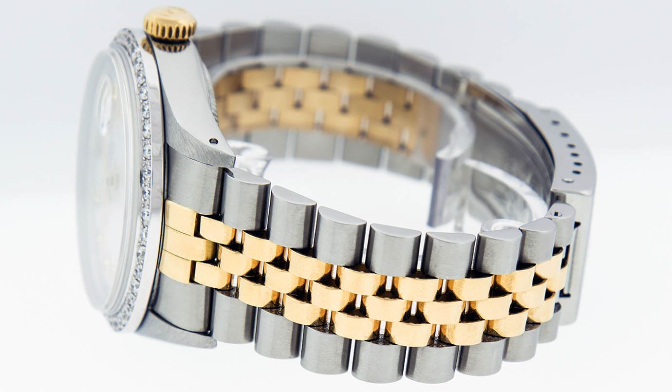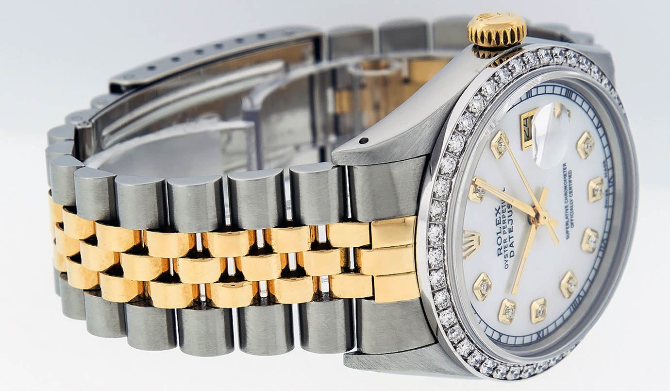 One Mens 14K Yellow Gold Two Tone Rolex Datejust Polished, Serviced & Electronically Tested, 14K Yellow Gold & Stainless Steel Case: 36mm, 14K Yellow Gold Crown, Custom Bezel: 18K White Gold Beadset Diamond Bezel, Diamond Count: 44 Diamonds, Total Weight 1.00 Carat, Clarity: SI-VS, Color: G to H. Custom Crystal: New Synthetic Sapphire Cyclops Lens. Custom Hands: New Luminecent Hands. Movement: Automatic Winding Movement Caliber 3035. Custom Dial: Mother Of Pearl Diamond Dial, 10 Diamonds in Dial G To H In Color, SI-VS Clarity, Date Window: 3 O'Clock Position Date Display, Quickset, Model: 16013 Datejust. Condition: G-6 Extra Fine. Bracelet:Two Tone 14K Yellow Gold & Stainless Steel Jubilee. Bright Polish. 7.0 Inch Length, Adjustable. Standard Clasp, With Rolex Logo. This Watch Has Been Serviced Time Tested And Is In Excellent Condition It Is Free Of All Scratches And Dents.